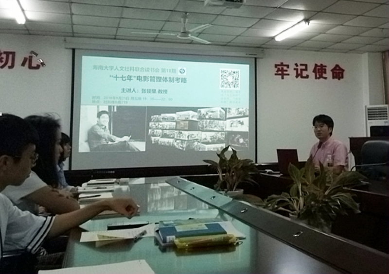 人文社科联合读书会第10期——由张硕果教授主讲的“十七年”电影管理体制考略在社科楼B719顺利举行。 本次读书会由李音老师主持,张硕果老师主讲。分别从制片、发行、放映三个视野,依次梳理了“十七年”电影管理体制的发展演变情况。此次讲座不仅丰富了与会师生的知识,开拓了学术研究的视野,更在史料研究方法上带来极大启发。 讲座之后与会老师纷纷做出精彩点评,同学们也积极参与讨论提问。同学们纷纷表示通过这次讲座学到了许多课本上查阅不到的知识,亦有同学庆幸借此机会纠正了自己的知识误区。大家希望今后能通过读书会跟老师进行学术上的沟通交流,取得学术上的长足进步。