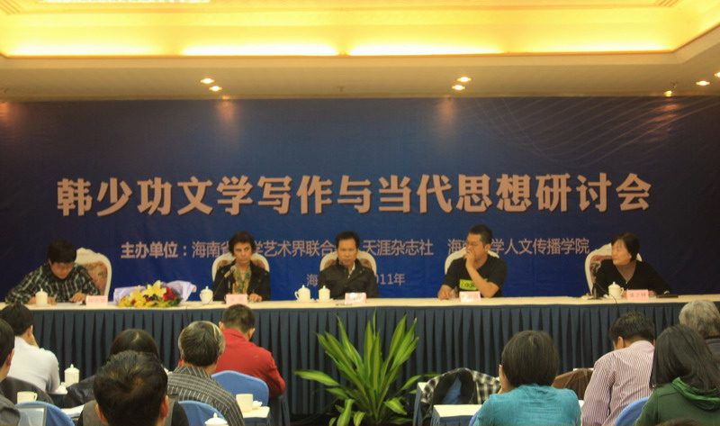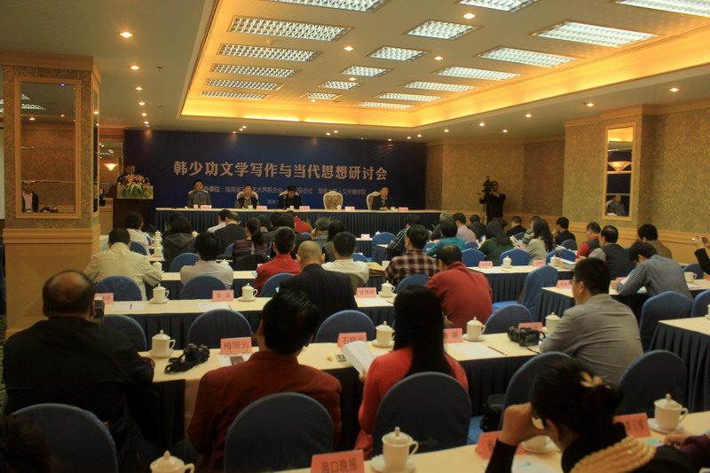 人文传播学院院长闫广林也表达了对韩少功及与会代表的感谢,海大文学院研究生代表广大读者向韩少功献花致敬。 在随后进行的大会发言中,来自海外的学者,如法国的安妮、日本的千野拓政、韩国的白池云,以及国内北京大学、清华大学、中国社科院、中央民族大学等院内和学术机构的著名学如韩毓海、旷新年、董之林、李云雷、敬文东,和来自省内的专家学者如孔见、单正平是等先后进行了精彩的发言。在8日下午进行的圆桌讨论会上,各位学者展开了唇枪舌战,思想的火花在会议中不断碰撞,现场掌声与笑场不断出现。在闭幕式上,韩少功最后发表了讲话,对当下中国文学、思想状况发表了自己的评论。