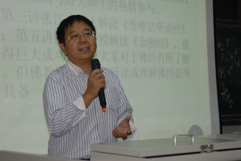 ,与老朋友叙旧和做学术交流。 本场讲座张三夕教授以“定力与空性”为题展开对《楞严经》大义的解读。联系东方经典系列讲座第三讲张江南博士解读《维摩诘所说经》,第五讲熊开发教授解读《金刚经》,张三夕教授认为对于博大精深的佛学,研读和理解佛经应具备以下准备性的知识与经验做基础:一、对印度的历史文化、地理、风俗、语言等有一定的了解;二、要了解佛教的创始人释迦牟尼,能记清释迦牟尼的多个称谓和其十大弟子的名字;三、要能对佛家的基本教义和关键词有精到的把握和理解,如《楞严经》中所涉及的“六尘”、“六根”、“六入与六出”、“十八界”等;四、要了解佛教的分层与分期;五、本人应有一定的修行经验,特别是一种“内明”的体验;六、要明确佛经讲解释义中的风险,讲解佛经需要极高的佛学修养和内明实证功夫。 在一段专业性的指导之后,张三夕教授围绕《楞严经》的经名、因缘、历史地位及其价值展开讲解。《楞严经》全名《大佛顶如来密因修证了义诸菩萨万行首楞严经》,经名释义丰富。《楞严经》的传入和译介则有着传奇的经历,据载唐中宗神龙元年(705年),中印度僧人般剌密帝用极细的白毷(毛)写出《楞严经》,用蜡封妥,割开臂膀,潜藏皮下,传到中国。传说经四人之力,由当时宰相房融笔受润色,得以翻译面世。《楞严经》在佛经中是正法的代表,被誉为佛法的眼睛,经文集中反映了佛法的宇宙观、人生观、价值观,全面道出了佛法的本体论、认识论、实践论等诸问题,世人曾有“自从一读《楞严》后,不看人间糟粕书”之说。 在接下来围绕《楞严经》大义的解说中,张三夕教授首先指出《楞严经》的宗旨大纲和核心命题是:“信佛者面对无时无刻不在变化的 ‘尘根’,如何离尘脱根,直指人心,修炼坚固的楞严大定,从肉身中发现不生不灭的空性。”全经解行并重:前四卷是“解”,是经文的重点和主体部分;后六卷是“行”或“证”(修行或修证)。接着张三夕教授重点围绕第一二卷的主体内容:“七处征心”、“十番显见”展开讲解,在其看来“七处征心”重点辨析一个心性本体论问题:心在何处?而“十番显见”则是在辨析一个心物认识论问题:何为见性?如果说“七处征心”是破妄,那么“十番显见”则是显真。在对“十番显见”的讲解中,张三夕教授以机智的佛学比喻使听众体悟到显见即“见性”,我们自性即“空性”中“能见的功能”不依赖眼睛和任何物质条件而独立存在,是永恒不息的生命之流。如何从肉身中发现不生不灭的空性是《楞严经》的核心问题。在张三夕教授看来,“十番显见”有多方面的现代启示意义:一、空性向每个个体承诺绝对自由,绝对自由转为永恒的生命理念。二、领悟空性并不意味着拒绝俗世事务。三、见性不因对象变化而变化,能见就是一种根性。四、人性是空性在生命体中的显现,人性同时也是空性的遮蔽。五、在感知“空性”中,世俗人生也需要定力、空性的修证。六、通过楞严大定的修炼而透彻领悟空性,将空性的领悟转化为日常的道德自律,值得去思考,也不失为当下中国人丧失道德底线(即丧失定力)的解决方案之一种。七、阅读《楞严经》,要领略语言的精准、美妙,值得涵泳和学习。 讲座的最后张三夕教授借用南怀瑾先生《楞严大义序》中的一段话祝福现场听众:悟得真实智慧解脱的真理,使这个颠倒梦幻似的人生世界,能升华到恬静安乐的真善美之领域。张三夕教授的博学宏富和充满激情的精妙讲解获得了全场听众起立长时间雷鸣般的掌声。在互动环节,张三夕教授还热情的回应解答了听众提出的各类问题。