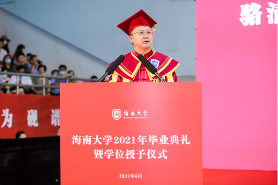 刚刚发言的毕业生代表吴雨蔚同学,选修过我的《先秦诸子导读》,我们曾在三教的课堂上结下师生之缘;今天又在这毕业典礼的殿堂上邂逅,共话离情别绪,同绘美好愿景。李白在告别自己多年读书的匡山时,曾写道:莫怪无心恋清境,已将书剑许明时。既然大家已经将自己的文武才华许给这样一个清明美好的时代,那就希望雨蔚同学,也希望2021届所有毕业生,在未来的人生道路上,果决而不鲁莽,润泽而不油腻,晶莹而不耀眼,大气而不张扬,独立而不孤单,做自己,做自己喜欢!
