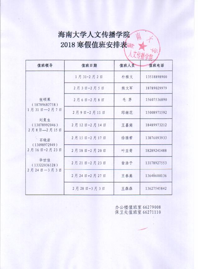 人文传播学院寒假值班表