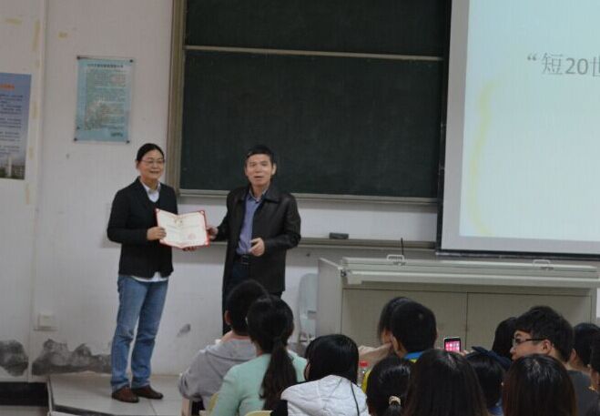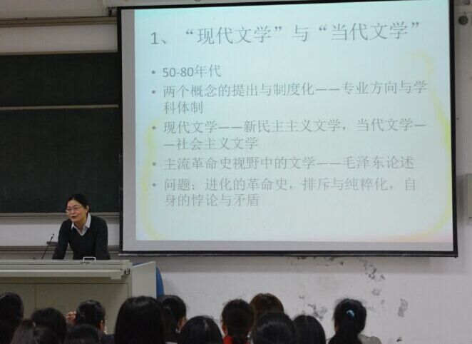 中文系学生讲授《现当代文学研究》课程。本次课程面向2012级与2014级汉语言文学专业200名学生开设,一些慕名而来的研究生、其他年级及专业的学生亦穿插在听众席中。