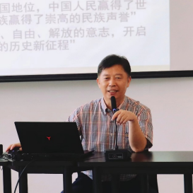 海南师范大学文学院王学振教授的报告主题是《研究抗战文学,传承抗战精神》。王老师首先强调,习近平总书记《在纪念中国人民抗日战争暨世界反法西斯战争胜利75周年座谈会上的讲话》高度评价抗日战争的伟大历史意义,同时也揭示了抗战精神的丰富内涵:“中国人民在抗日战争的壮阔进程中孕育出伟大抗战精神,向世界展示了天下兴亡、匹夫有责的爱国情怀,视死如归、宁死不屈的民族气节,不畏强暴、血战到底的英雄气概,百折不挠、坚韧不拔的必胜信念。”王老师认为,抗战文学直接参与了抗战的历史进程,同时也是记录抗战历史、形成并传承抗战精神的最为重要的形象化、情感化载体,对抗战文学进行了解、研究,是铭记抗战历史、传承抗战精神的重要途径。目前对抗战文学的研究存在一定的窄化、简化倾向,应着力于抗战文学的历史还原,认识其丰富性、多样性。