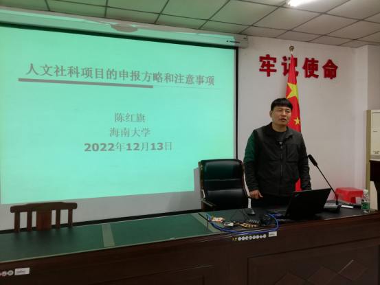 第一场交流会由陈红旗教授主讲,题目为《人文社科项目的申报方略和注意事项》。陈红旗教授从前期准备需要注意的事项、选题时应该注意的问题、阅读和推敲文件的重要性、格式上容易出现的问题等方面,与参会教师分享了申报国家社科基金项目的经验和体会,鼓励大家扎扎实实做研究,丰富前期成果,为国家社科基金项目的申报做好充分的准备。陈红旗教授还从中国式现代化、马克思主义中国化时代化、中华优秀传统文化精髓与马克思主义的贯通、“四个自信”等角度深入阐释了党的二十大精神,希望与会教师能学有所用,知行合一,学习和贯彻党的二十大精神,做好人文社会科学领域的研究工作。