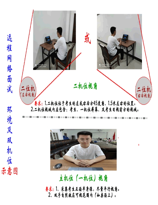 “双机位”,即考生面试过程中,需要有两台音视频设备同时工作。一台为主机位(一机位),负责采集考生正面上半身视频信息和音频信息;一台为二机位,负责采集考生所在环境的全景视频信息和音频信息。“研究生招生远程面试系统”的“双机位”设置及要求如下: