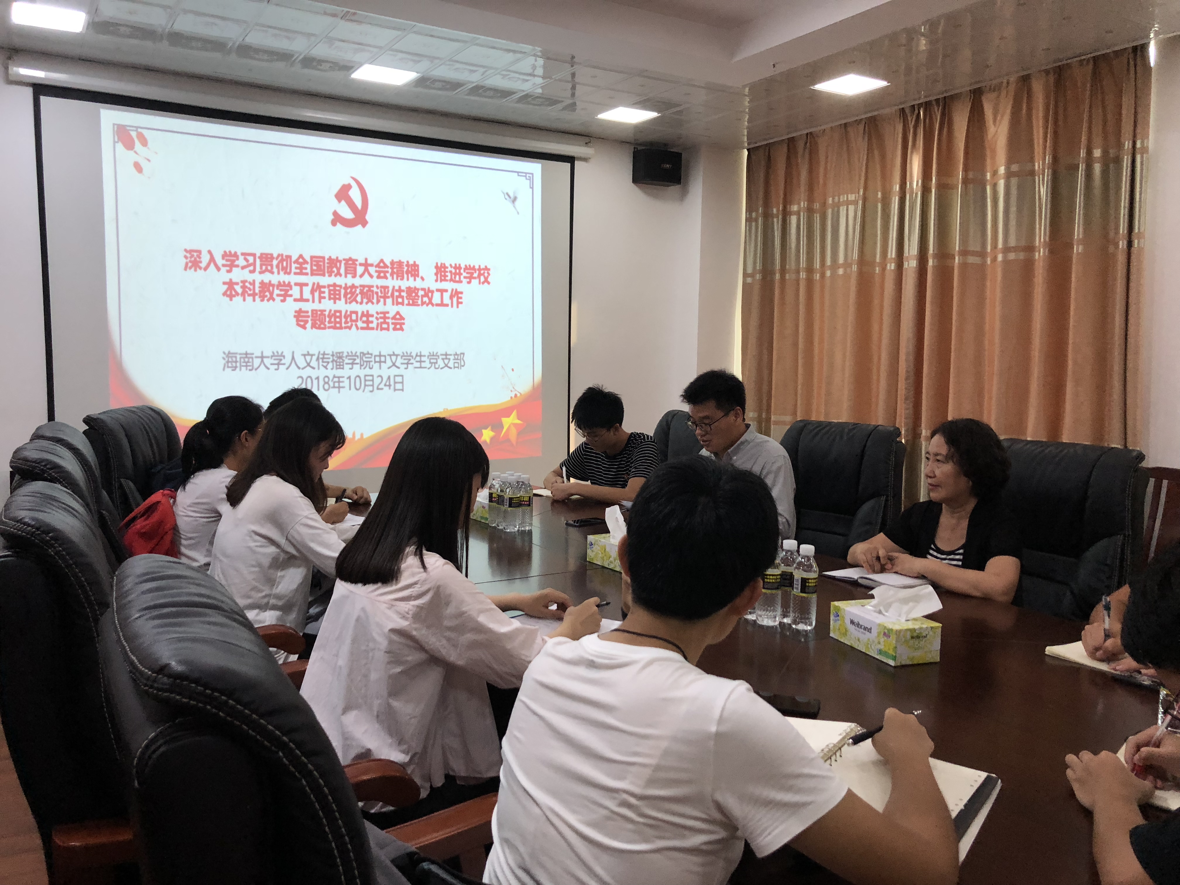委员会组织部《关于召开深入学习贯彻全国教育大会精神、推进学校本科教学工作审核预评估整改工作专题民主生活会和组织生活会的通知》精神及学院党委的工作安排,2018年10月24日下午,中文学生党支部在社科楼B615会议室召开专题组织生活会,会议由支部书记熊文军主持,学院党委副书记孙晓媛出席会议并讲话,中文学生党支部全体学生党员参加会议。