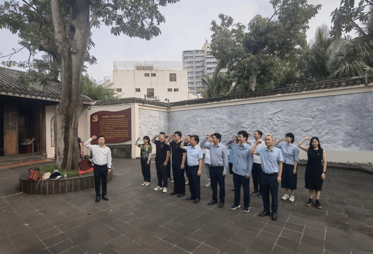 在一大旧址进院门前左右墙上分别悬挂着鲜红的党旗和庄严的入党誓词激励着共产党员的使命担当,在党委书记杨元广的带领下,大家举起右拳,以坚定有力的宣誓声,通过重温入党誓词,表达高举理想之旗、终身为党事业奋斗的坚定决心。
