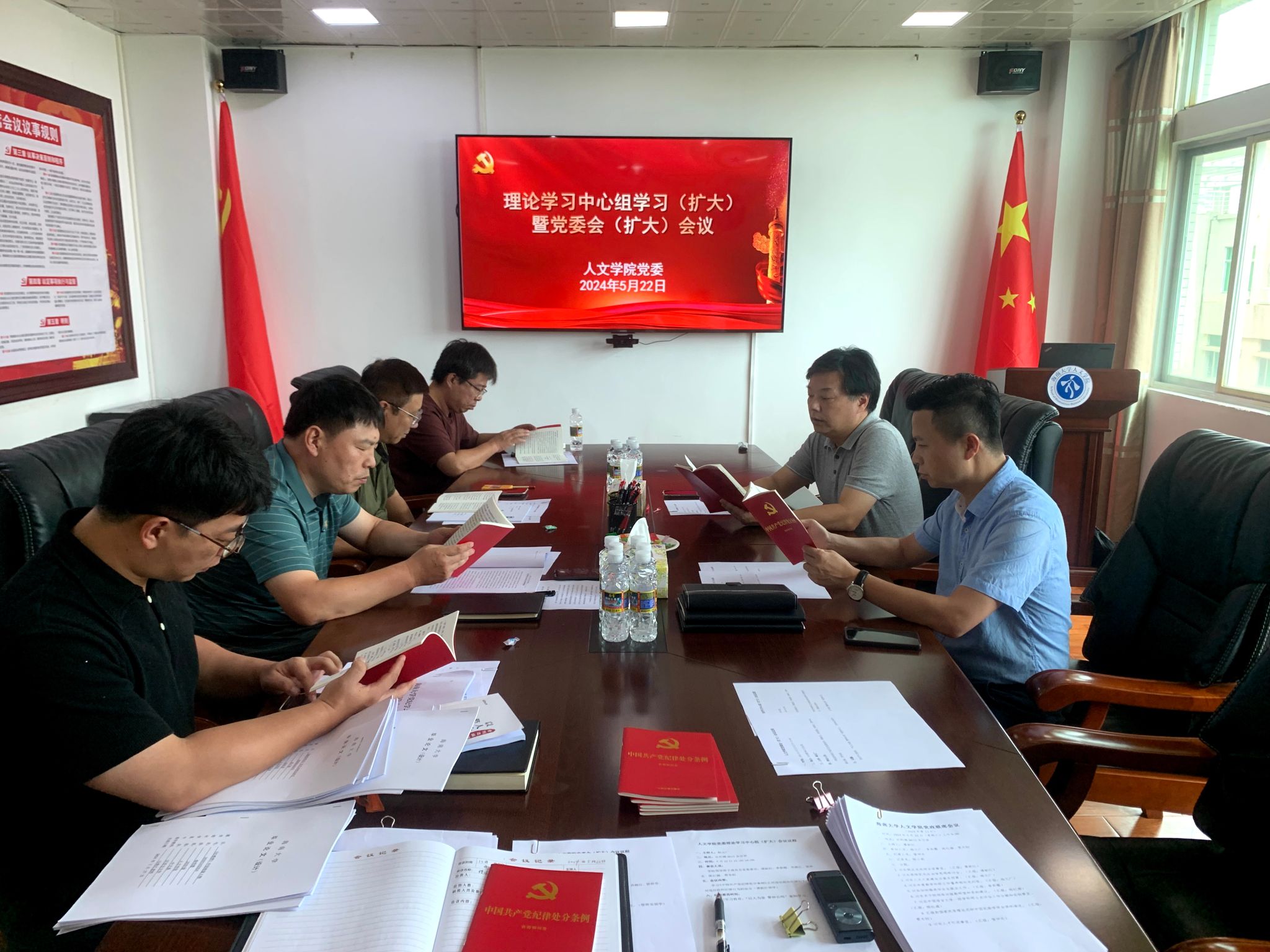党委书记杨元广在社科楼B615会议室主持召开党委理论学习中心组(扩大)学习会议暨党纪学习教育——读书班。学院院领导、党委委员等参加会议。