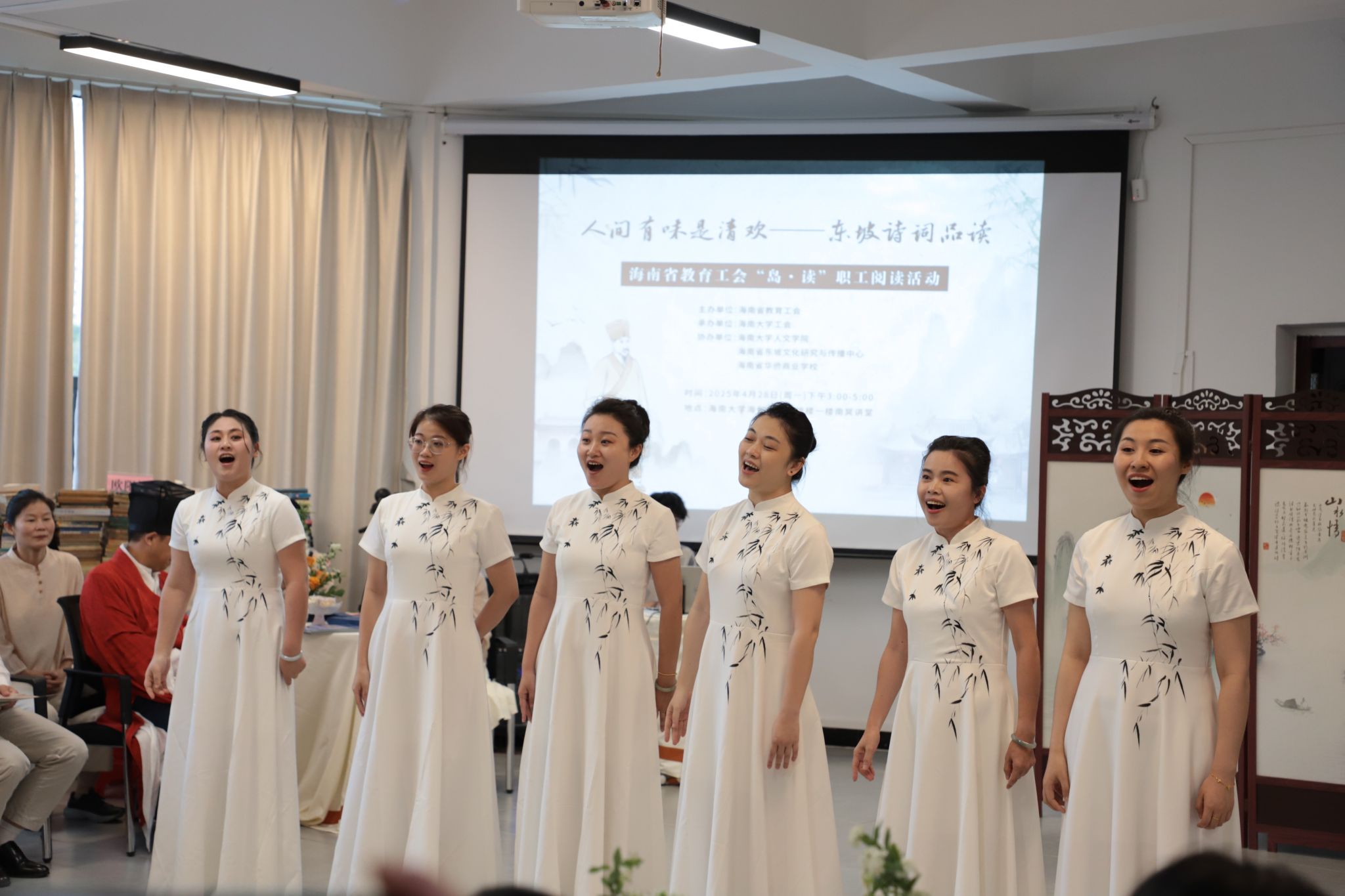 活动现场,传统与现代的碰撞激荡出文化传承的新火花。海口市白杨教师合唱团创新演绎的东坡词曲,将儋州山歌元素融入《水调歌头·明月几时有》《江城子·江景》中,海南职业技术学院蔡建东教授创作东坡歌曲《平生功业黄惠儋》,让“坡迷”们感受到东坡文化与音乐的融合魅力。当全体教职工齐声诵读“但愿人长久,千里共婵娟”“知君不再见,欲去且少留”时,东坡精神与海南气质在琅琅书声中完美交融。