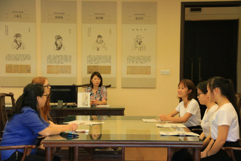 负责展厅讲解的团队成员,在省古籍保护中心办公室乔主任的指导下,查阅相关知识,按照古籍保护中心展厅的陈列顺序,身着一袭汉服,对读者进行“古籍史基础展陈”讲解。