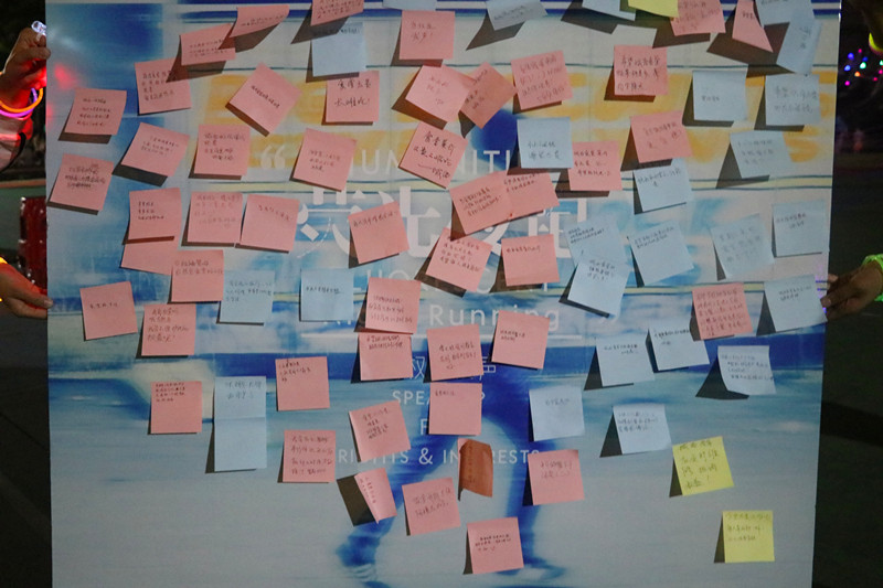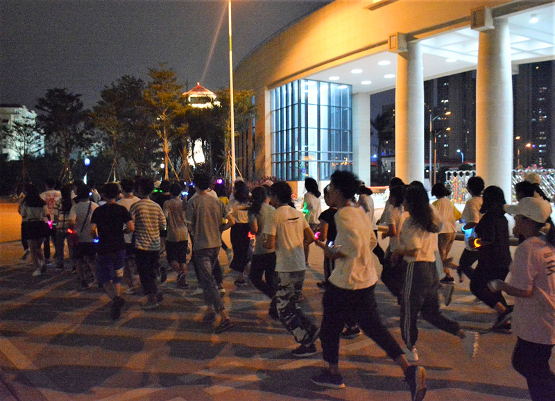 活动前期,部分夜跑活动工作人员提前到达活动场地紧锣密鼓地进行场地布置,演出排练,工具物资整理,组织签到等准备工作。全体工作人员参跑人员陆续到场后纷纷佩戴好荧光手环,发夹等物件,为渐暗的夜色添上光彩。活动伊始,介绍到场来宾,同时就权益自律部部门职责,权益投诉通道等方面内容进行宣传介绍。而后,文工团干事带来了精彩的开场舞蹈,动感的音乐配上激情的舞步,一时点燃全场气氛。节目结束后,主持人组织参跑人员将需要反映的权益问题写在便利贴上,贴于权益宣传板上,响应自主维权的号召。权益心声反映环节结束后,体育部人员组织参跑人员热身,夜跑环节就此拉开序幕,参跑人员摩拳擦掌,跃跃欲试。在确认道路安全畅通后,由体育部成员的带领下,同学们保持着整齐的队形,有序前行。从二田篮球场出发,绕宿舍区夜跑,途经新南门,起点草坪,思源学堂等最终返回二田篮球场。夜跑途中,道路工作人员及相关志愿者维持道路秩序并提供道路指引,助力夜跑环节的顺利进行。全体人员到达终点后,主持人组织参跑人员在横幅海报签名并宣布荧光夜跑活动圆满结束。