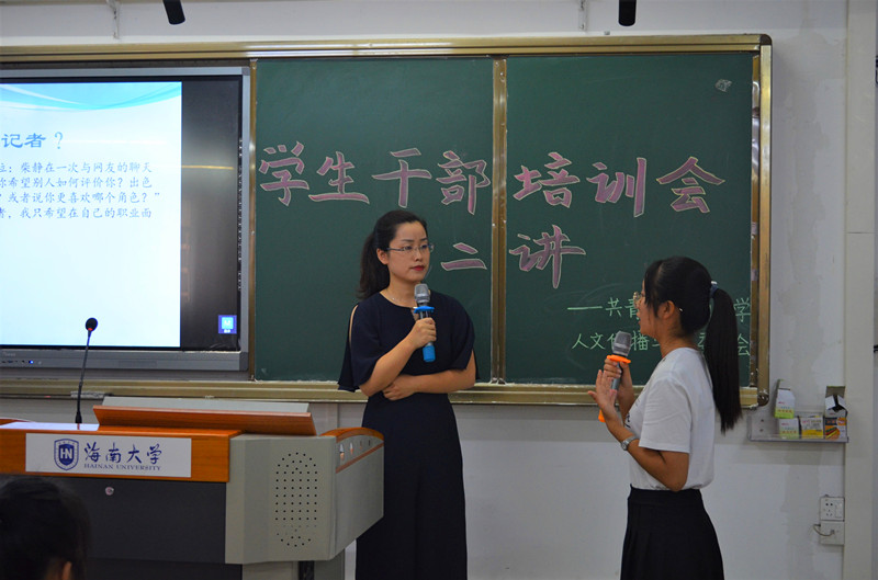 讲述过程中,同学们积极参与“寻找新闻图片”“模拟采访”等互动环节,切身体验记者采访工作,在互动中更加深入了解了新闻工作。在二十分钟的提问环节中,同学们就专业学习、就业面试以及新闻工作现状等问题积极提问,臧会彬耐心回答了同学们的问题,并给出了宝贵意见。她告诫同学们应该将人文情怀与职业操守放在首位,并且珍惜大学时光、确立人生方向、做到“术业有专攻”,把握海南省“人才引进”机遇,并肩担负起时代的担当、社会的责任,真诚的劝导给予了同学们莫大的鼓励。