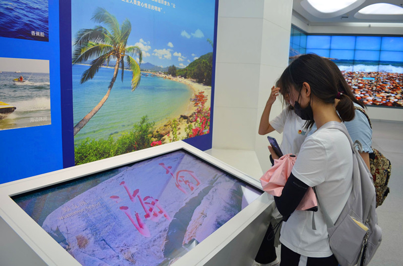 展览馆参观结束后,同学们又有序乘车前往海南省博物馆,大家的热情丝毫不减,分别去了“南溟泛舸”南海海洋文明陈列馆、“方外封疆”海南历史陈列馆等四个主题展馆。展馆数量有限但尽显了海南的独特魅力,同学们兴奋不已,互相讨论,拍照留念,场馆气氛融洽。海南作为海纳百川多元并包的文化交汇地,是孤悬海外、连通中外的琼台福地,曾作为海上丝绸之路必经之地闪耀于世界舞台。同学们在博物馆中将海南这处仙凡之地的美丽尽收眼底,在“南溟泛舸”厅追寻先辈渔民的冒险精神、在“香中魁首”厅体会沉香这一钟灵粹珍的高雅、在“琼肴街”展厅中感受汇聚中原美食、闽粤烹艺、南洋风味、黎苗食俗的海南饮食文化。变化的沧桑海疆与不变的南国风情在同学们心中留下了浓墨重彩的印记。尽管场地有限,但仍未限制同学们的浓厚意兴,展厅充斥着同学们流连忘返的身影与惊叹不已的赞叹。
