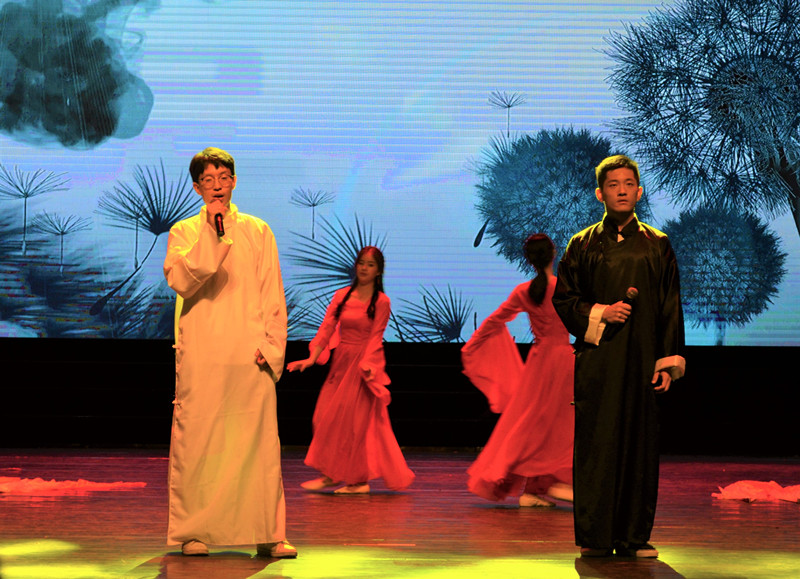 本场晚会分为三大篇章,首先,由16、17级学生联合带来的开场舞点燃了全场的氛围,跃动的节奏,灵动的身姿,彰显着人文院学子的青春活力。一场歌舞结束后,晚会正式进入第一篇章“洋鸟消夏记”。“我喜欢你爱我的心,轻触我每根手指感应”,翟颖与陈舒遥带来歌曲串烧《喜欢你》。两位同学用细腻的歌声唱出温暖的旋律,触动了在场观众们内心深处的情愫,引得现场掌声不断;而随后由学院文工团带来的舞蹈《1000%》,是清新的歌曲与俏皮的舞蹈完美结合,让观众们耳目一新;好戏开腔,红袖曼舞,17级中文三班和戏影二班的同学们带来古风舞蹈《步戏》,台上舞者莲步轻移,歌者如泣如诉,台下纷纷叫好。随后的抽奖环节中,主持人与观众们积极互动,又掀起了不小的轰动。