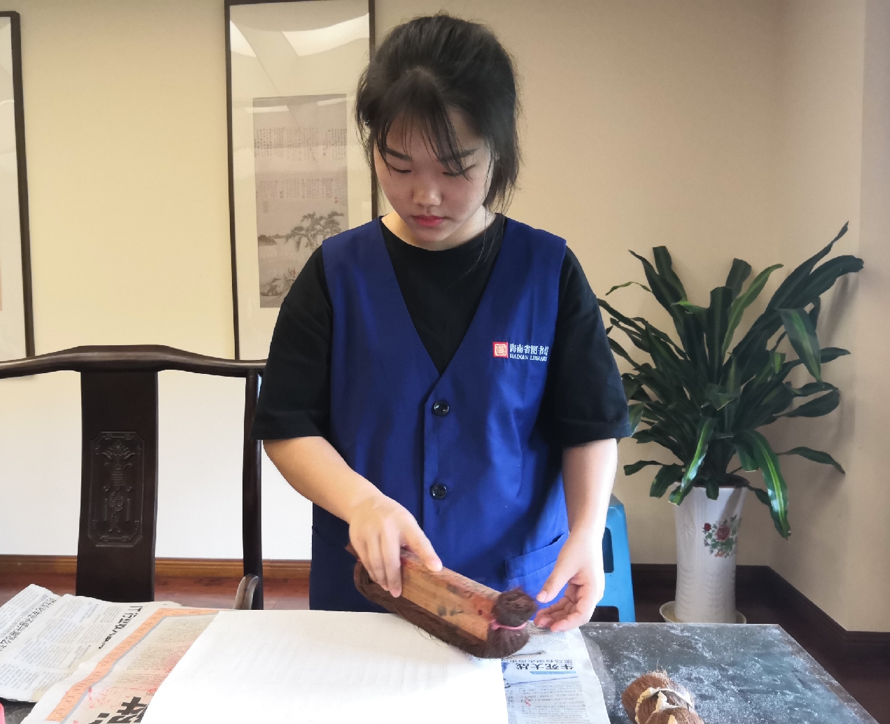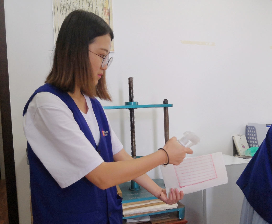 当日下午,志愿者们集合完毕后统一乘车前往活动地点。到达古籍保护中心后,志愿者们分成两组,以小组的形式进行活动。一组在老师的指导下进行雕版印刷,先在木版凸起的部分涂匀红墨汁,然后将纸覆盖在木版上,再用粽刷从中间开始,自上而下、轻轻拂拭纸背,直至全版范围逐一刷印完整。另一组则将已经刷印完成的纸页进行折叠,再用喷壶将其湿润,然后重叠放置,当纸页重叠达到一定的数量,再用木板盖压。