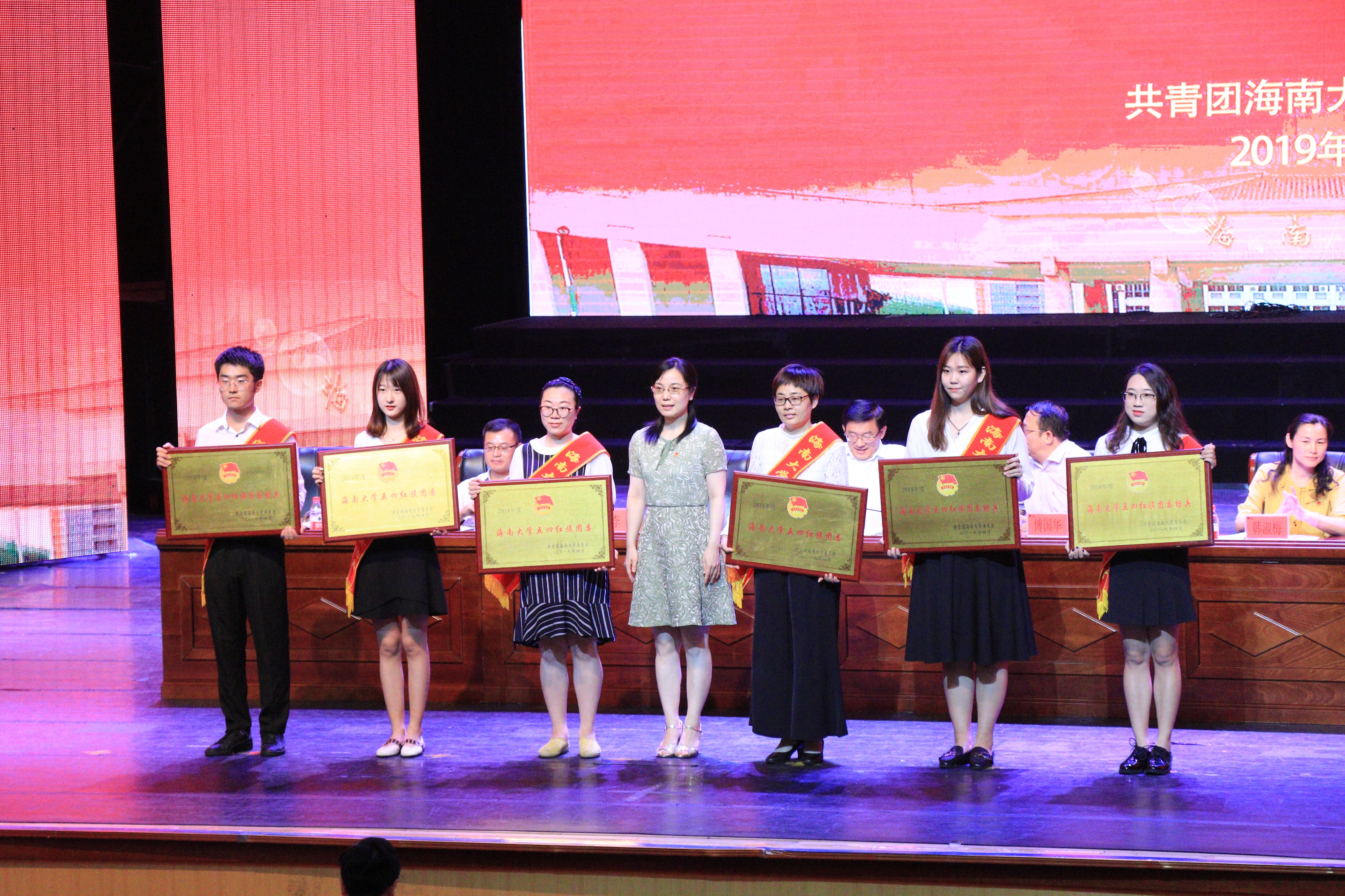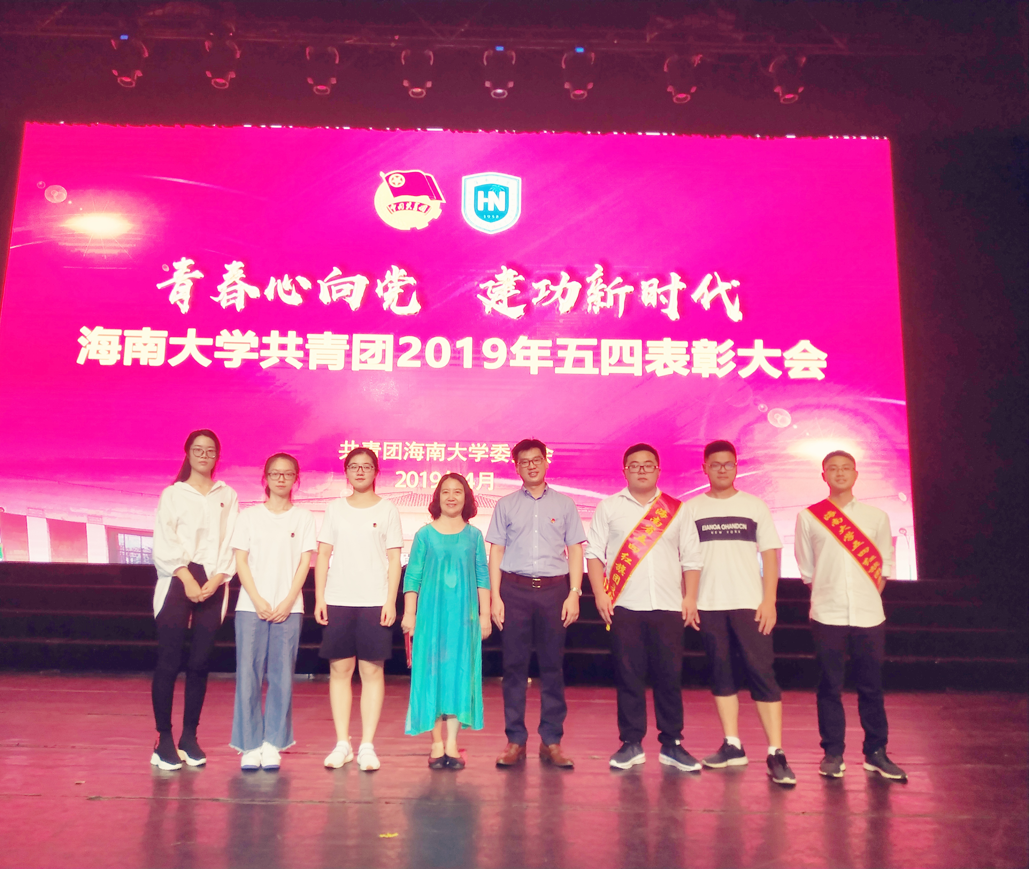 1、2016级汉语言文学1班团支书郭瑞鹏(右三)代表支部领受海南省2018年度五四红旗团支部表彰