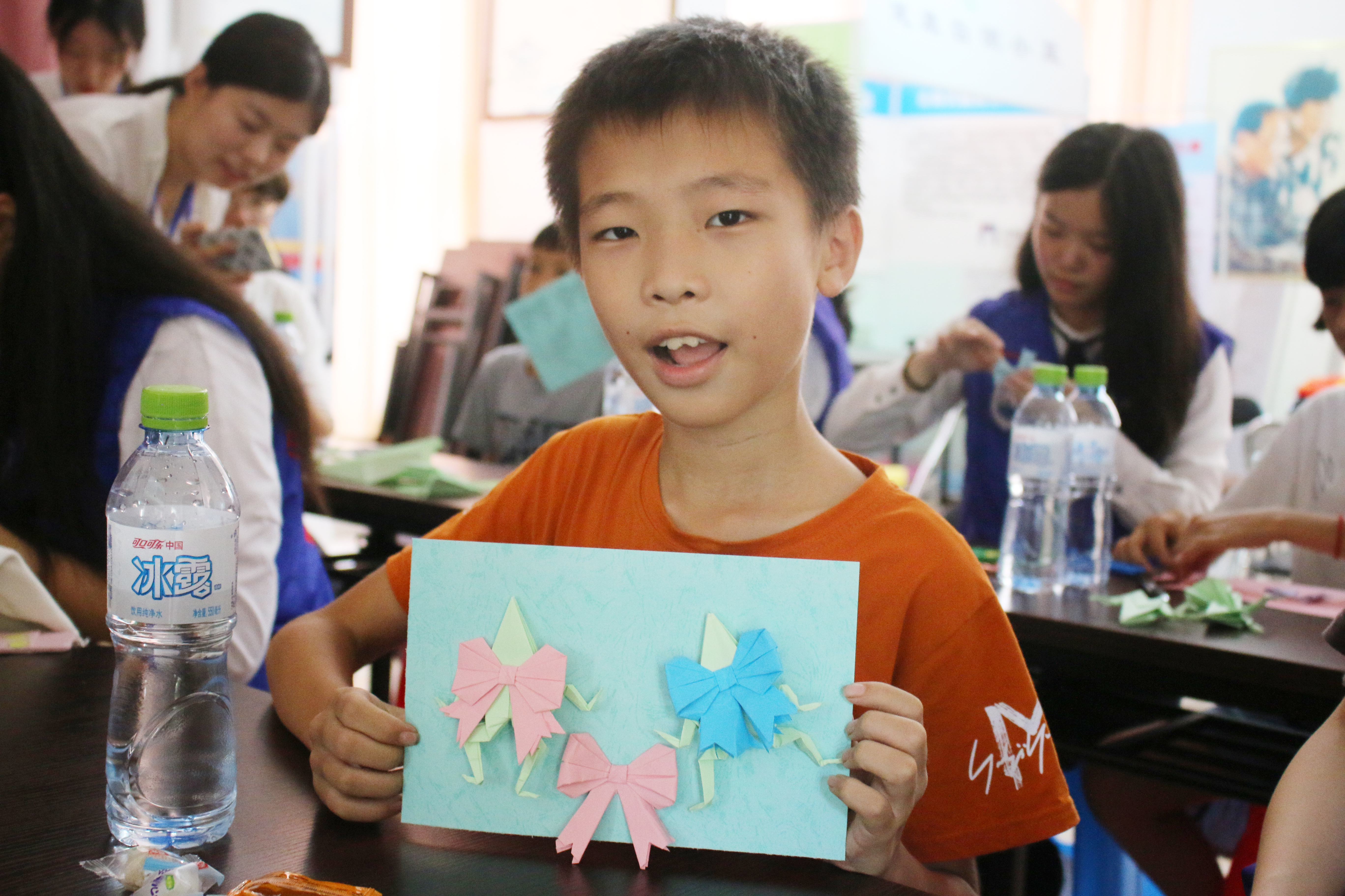 四维创意DIY协会工作人员的帮助下,志愿者和孩子们一同学习了几种不同的折纸方法。工作人员首先演示折纸步骤,然后逐一对孩子们进行指导,并贴心提醒志愿者和孩子们使用剪刀时注意安全。孩子们认真地折叠,与志愿者合作剪裁,不一会儿,活灵活现的小青蛙、可爱的蝴蝶结、饱满的爱心就在孩子们的手中诞生了。有的孩子将折好的蝴蝶结戴在头上,有的孩子还自由创作了剪纸与志愿者分享……他们迫不及待地向家长展示自己的作品,现场气氛欢乐而温馨。伴着轻快的乐声和着孩子们的笑声,活动圆满结束。