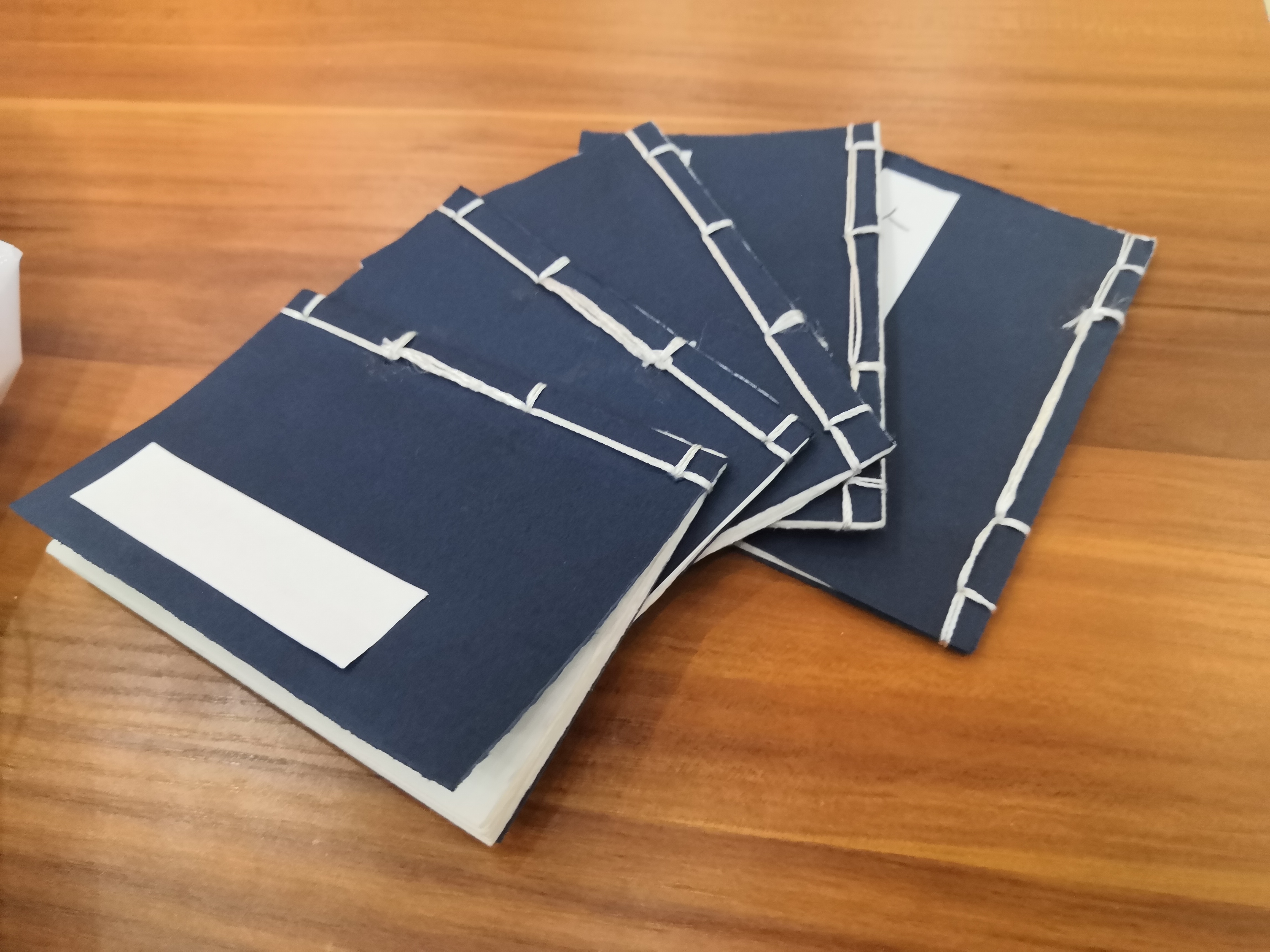 在线装书制作体验区,前来学习线装古籍制作工序的同学们络绎不绝,许多汉语言文学专业的同学表示,“前不久在课堂上学习过的线装书制作过程,今天竟然可以亲身实践体验,真是太幸运啦,以后我要多多关注院内志愿服务活动!”制作一本小型线装书也会耗时较久,同学们与志愿者围在桌边专注地打孔、穿线,一本本精美小巧的线装书在他们手中诞生。