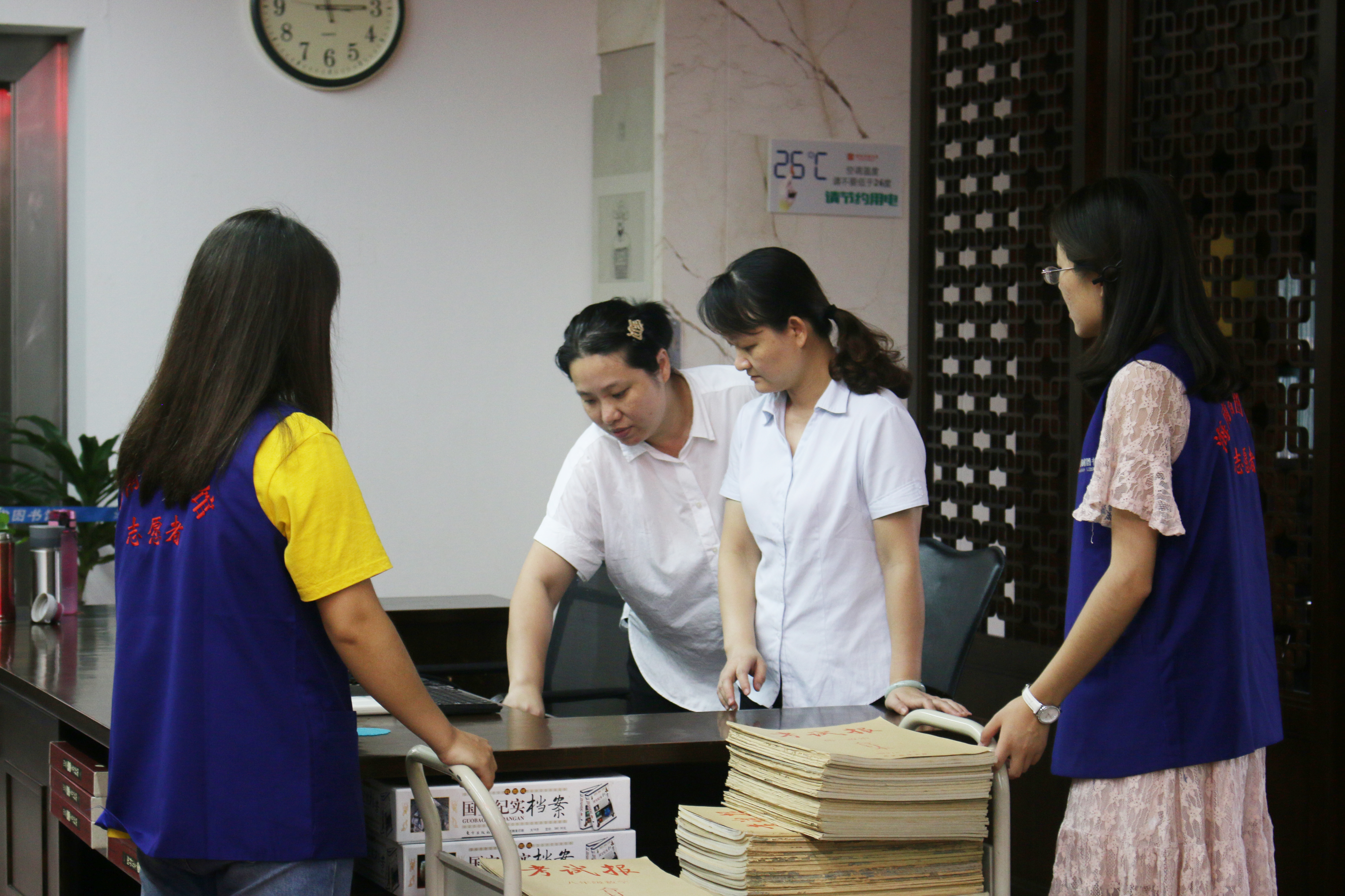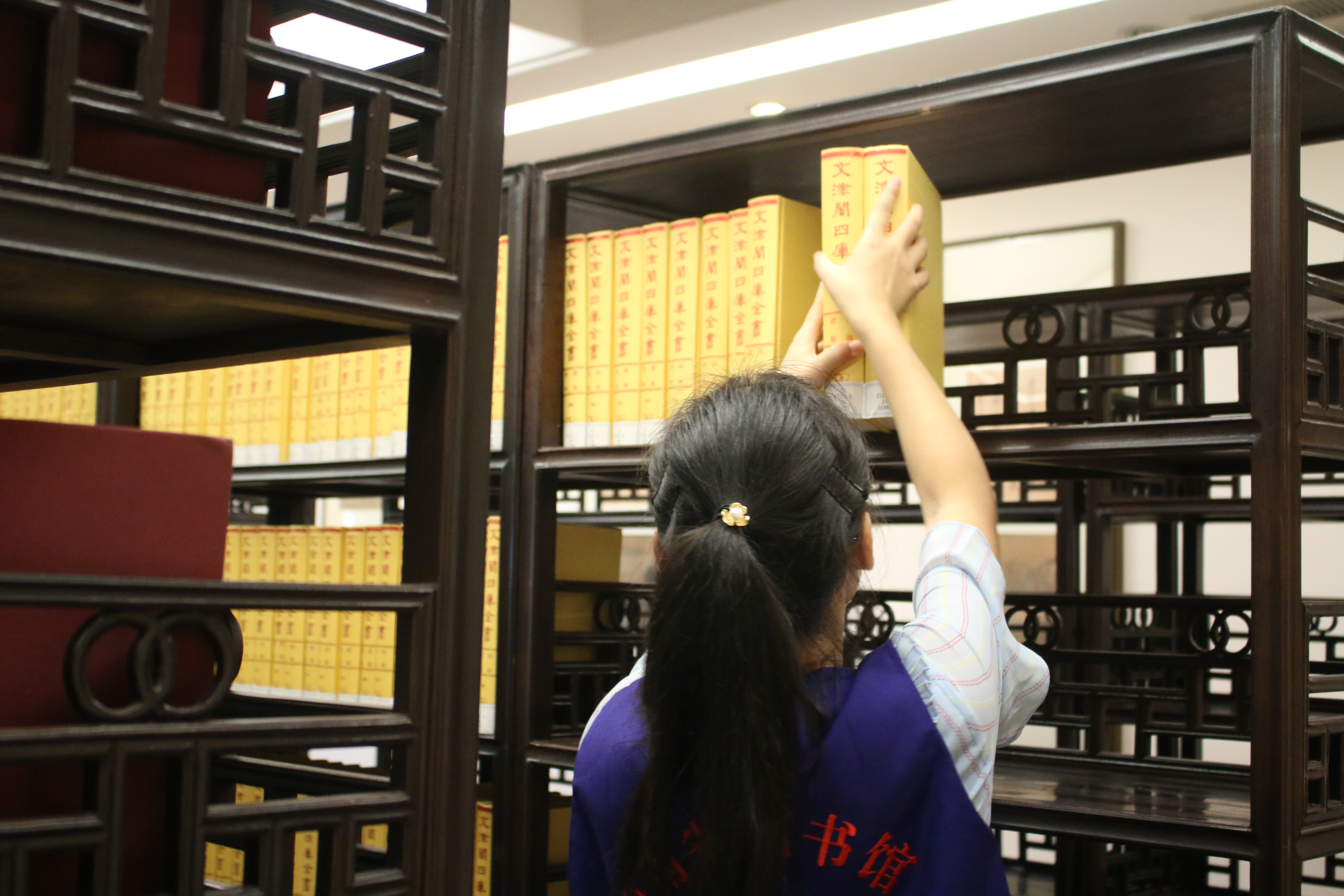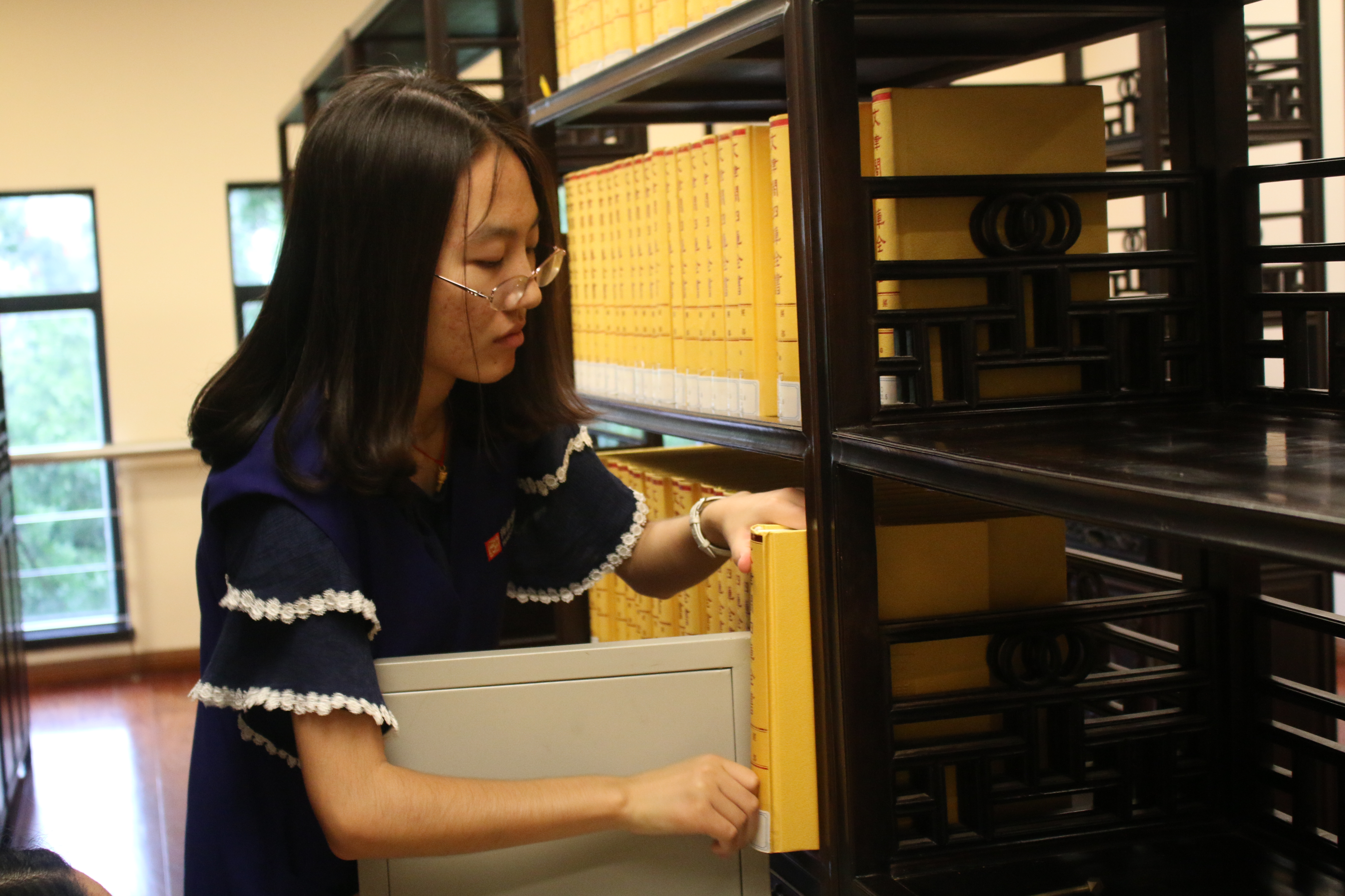 恰逢古籍保护中心整理古籍善本重新上架,在工作人员的安排下,志愿者们清理、擦拭书架,将古籍阅览室内的《钦定四库全书》等书籍登记、下架并整理入库,替之以全套1500余本《文津阁四库全书》。从古籍特藏室到古籍阅览室,卷帙浩繁的古书间到处都有志愿者们忙碌的身影。志愿者们从古籍特藏室中转移出古籍善本,按编号整理上架,以便日后读者借阅。志愿者们有序分工,高效地完成了工作。