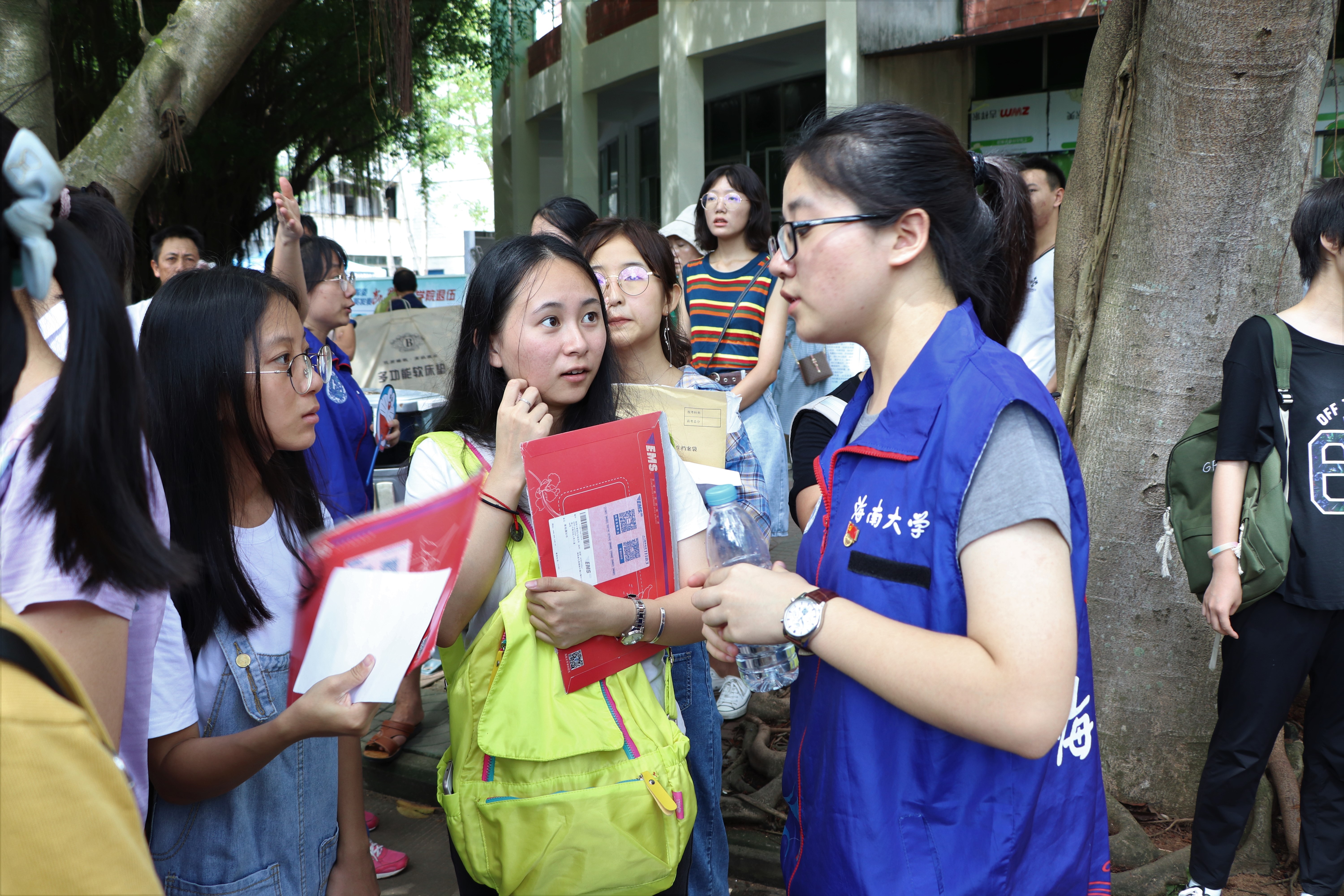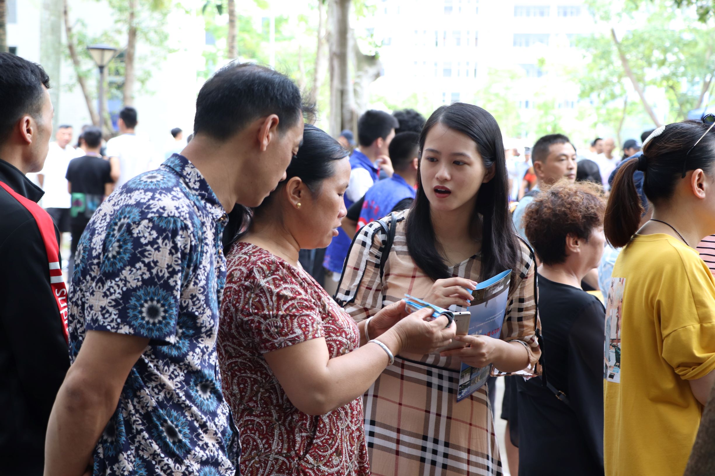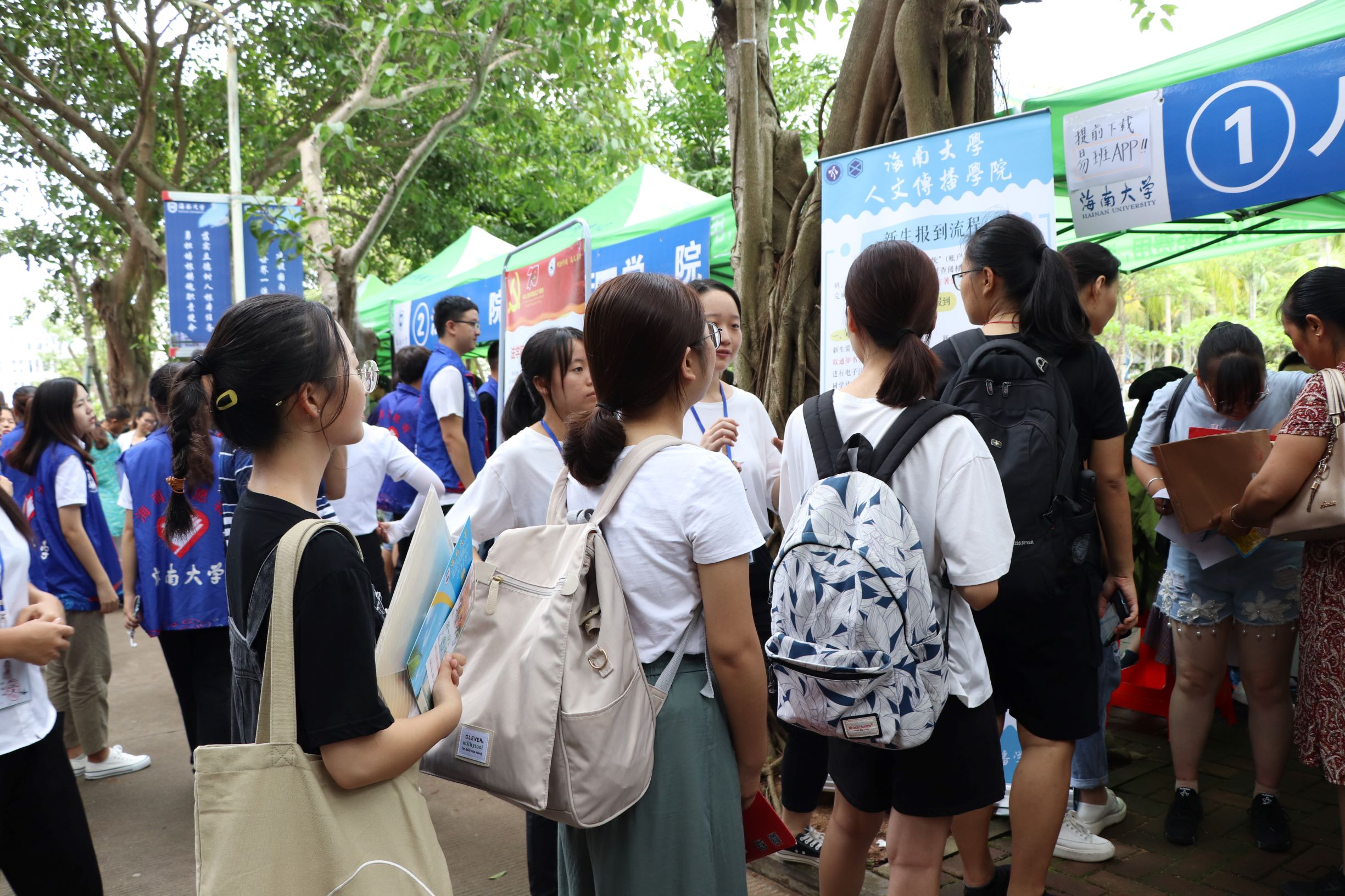 迎新的学生干部和志愿者们积极为新生和家长答疑解惑,志愿者们穿梭在人群中,帮助新生搬运行李并介绍报到注册流程。