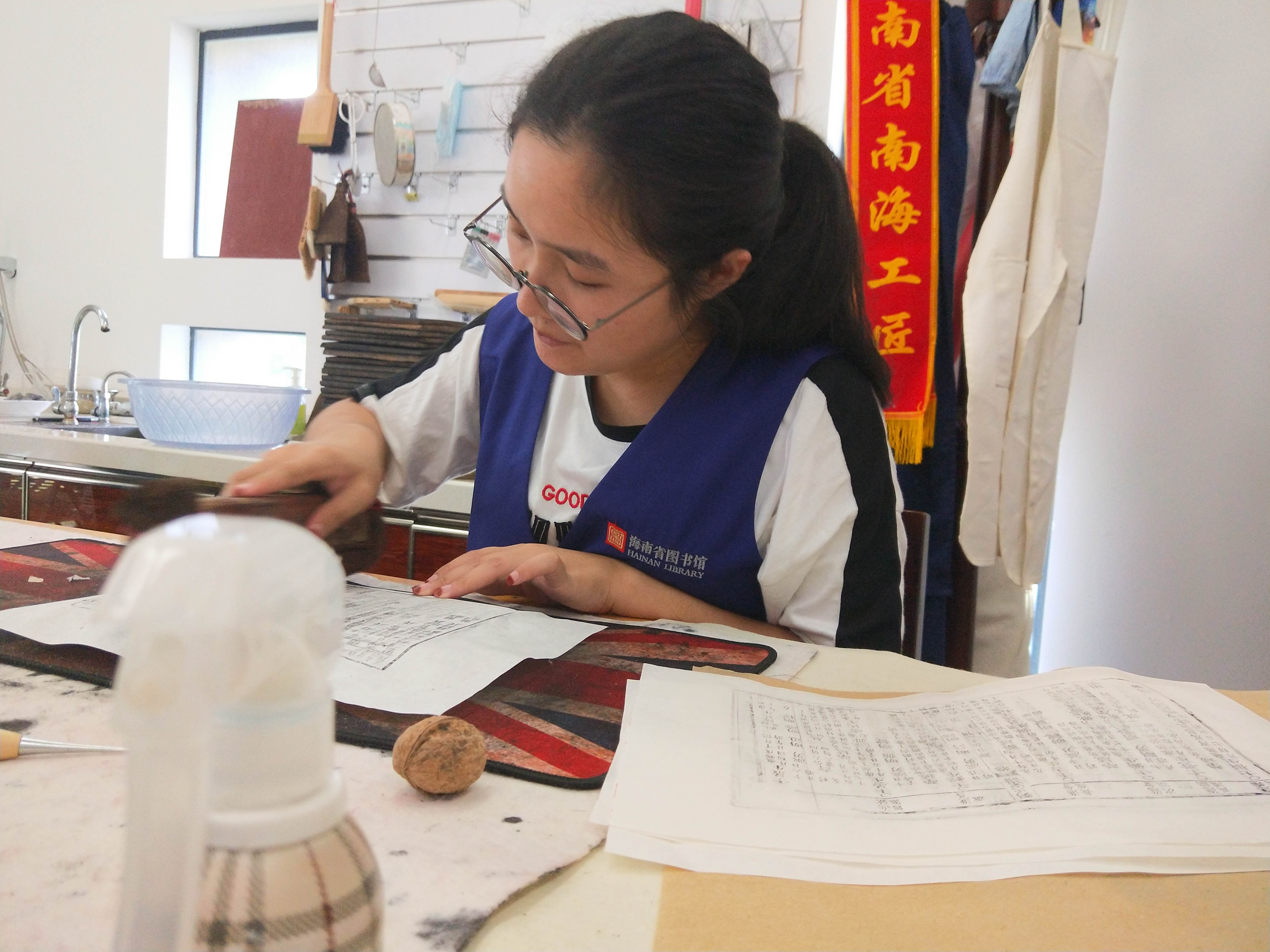 志愿者在省古籍保护中心老师的安排下分成三组,分别负责雕版印刷、分拣成品与书页排序。下午三时许,位于图书馆三楼的拓印室传来抑扬顿挫的刷子轻扫声。古籍保护中心的老师不断提醒着志愿者,“这里墨压的不够实”、“这里刷子这样扫更合适”……志愿者认真倾听着老师的指导,一步一步调整着传拓手法,拓印出的字迹逐渐清晰,墨迹逐渐平整,得到了老师的肯定。学习雕版印刷的志愿者在古籍保护中心老师的指导下,已经可以完整、清晰地拓印出一张完整的古籍资料。拓印出的书页则被送往阅览室进行整理排序装订,相关志愿者们已经做好了分工,从挑选、分拣拓印成品,到按页码排序,整理成册,井然有序地开展着工作。