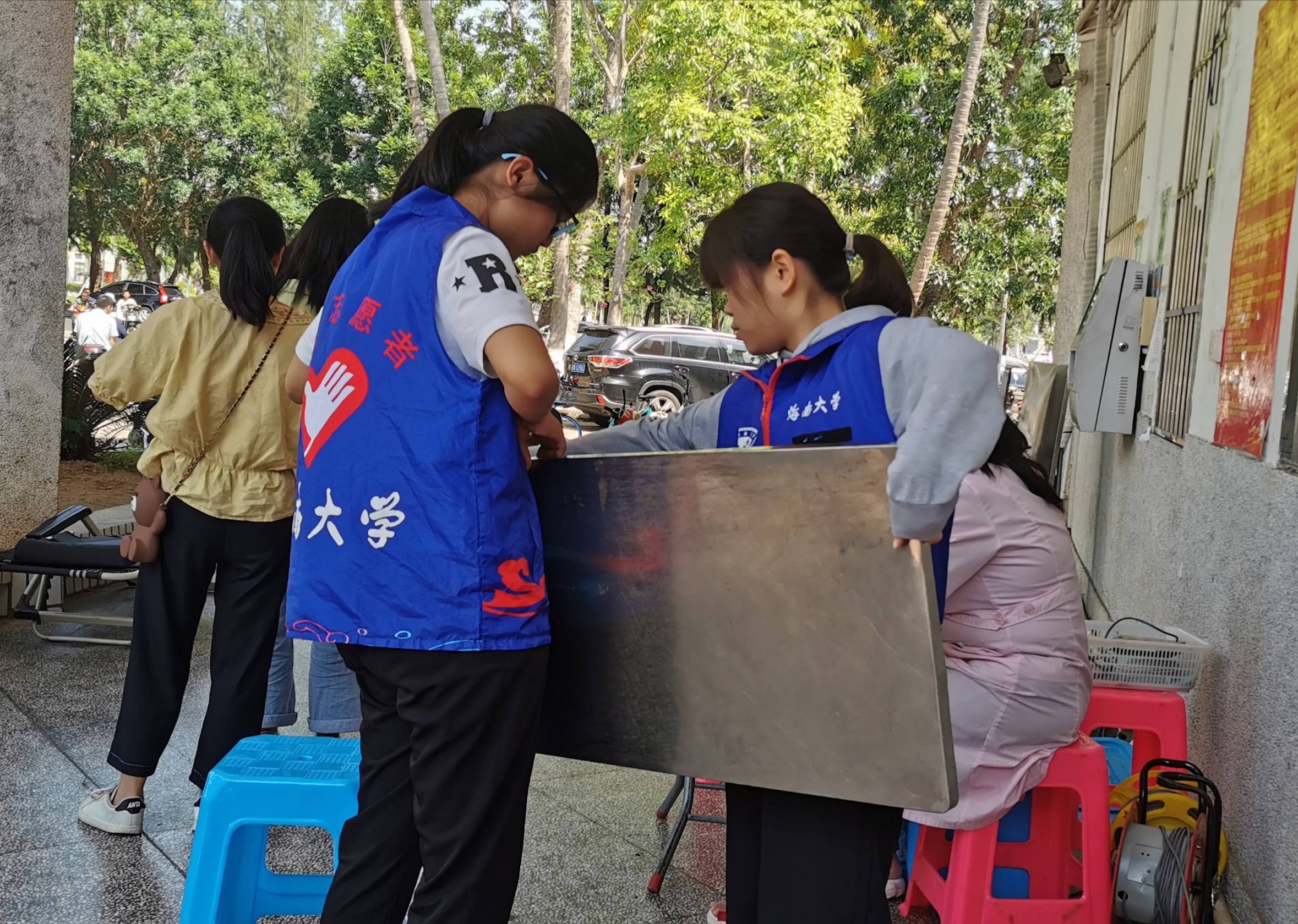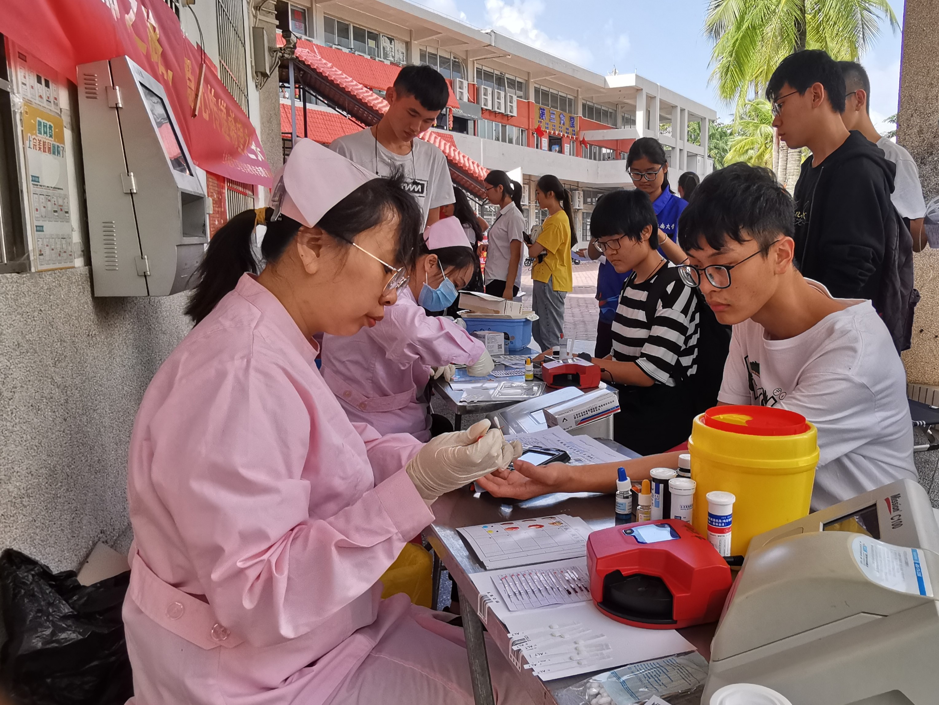 海甸校区二食堂门前,协助海南省血液中心开展“凝聚点滴,奉献爱心”无偿献血活动。