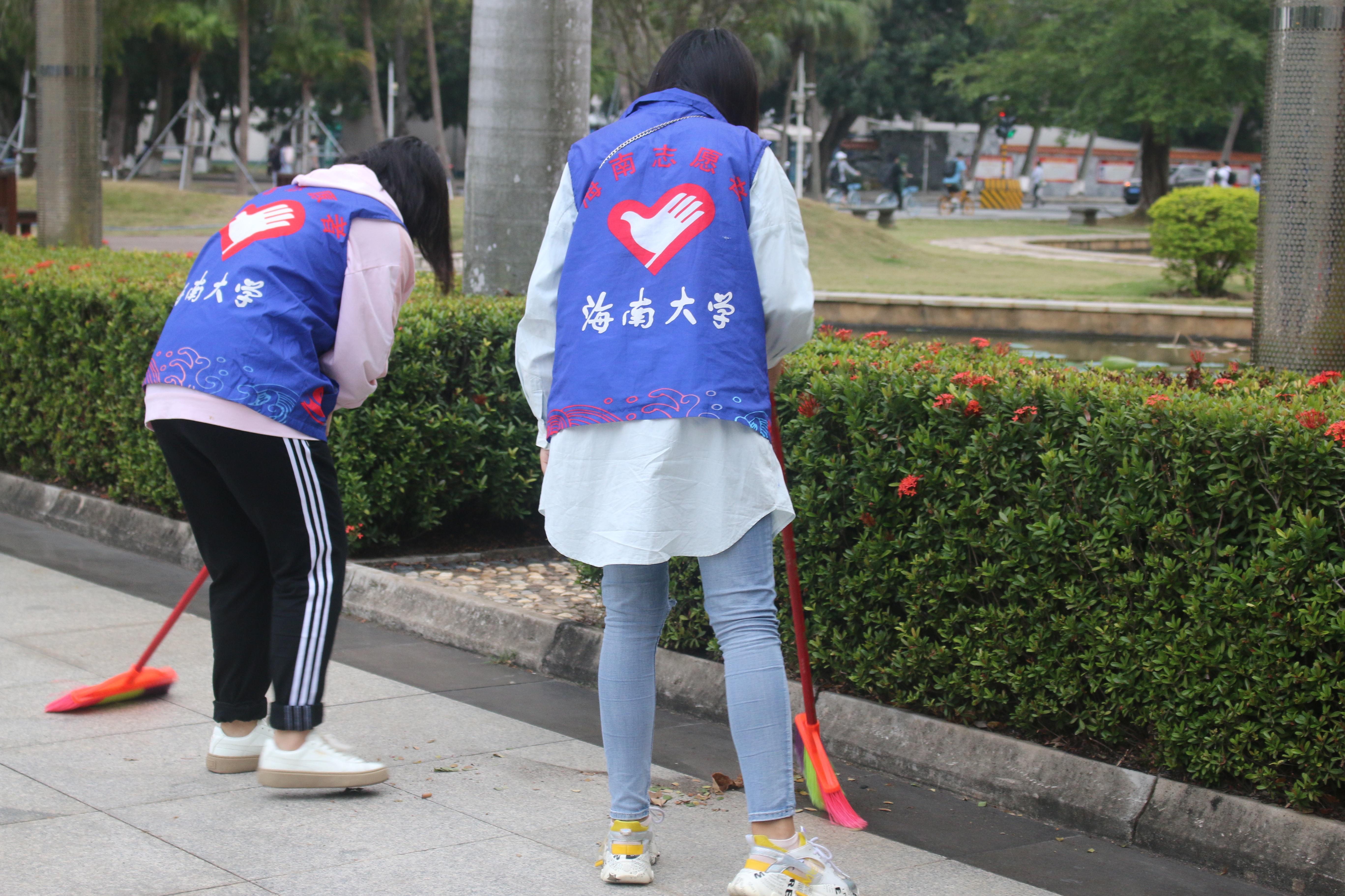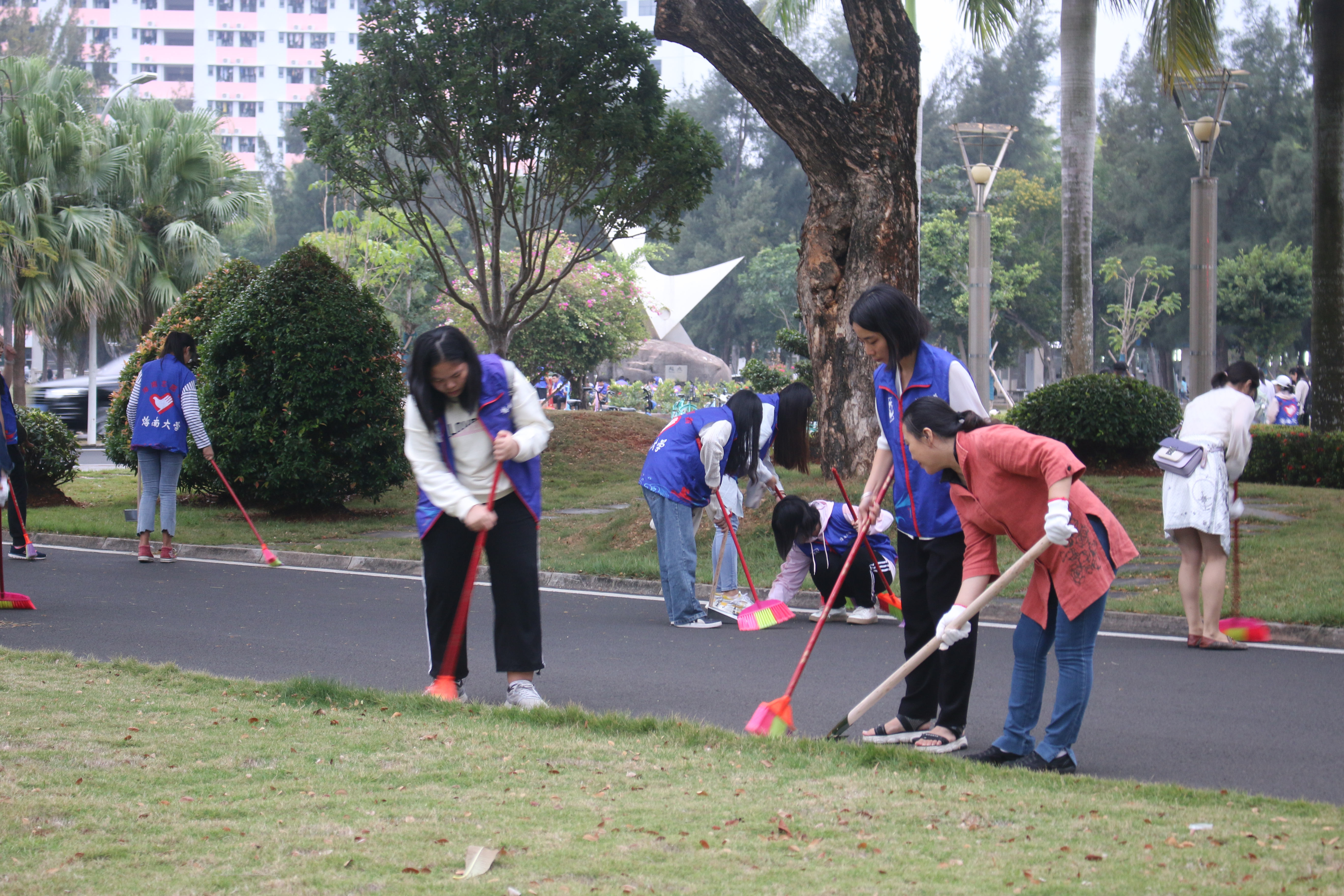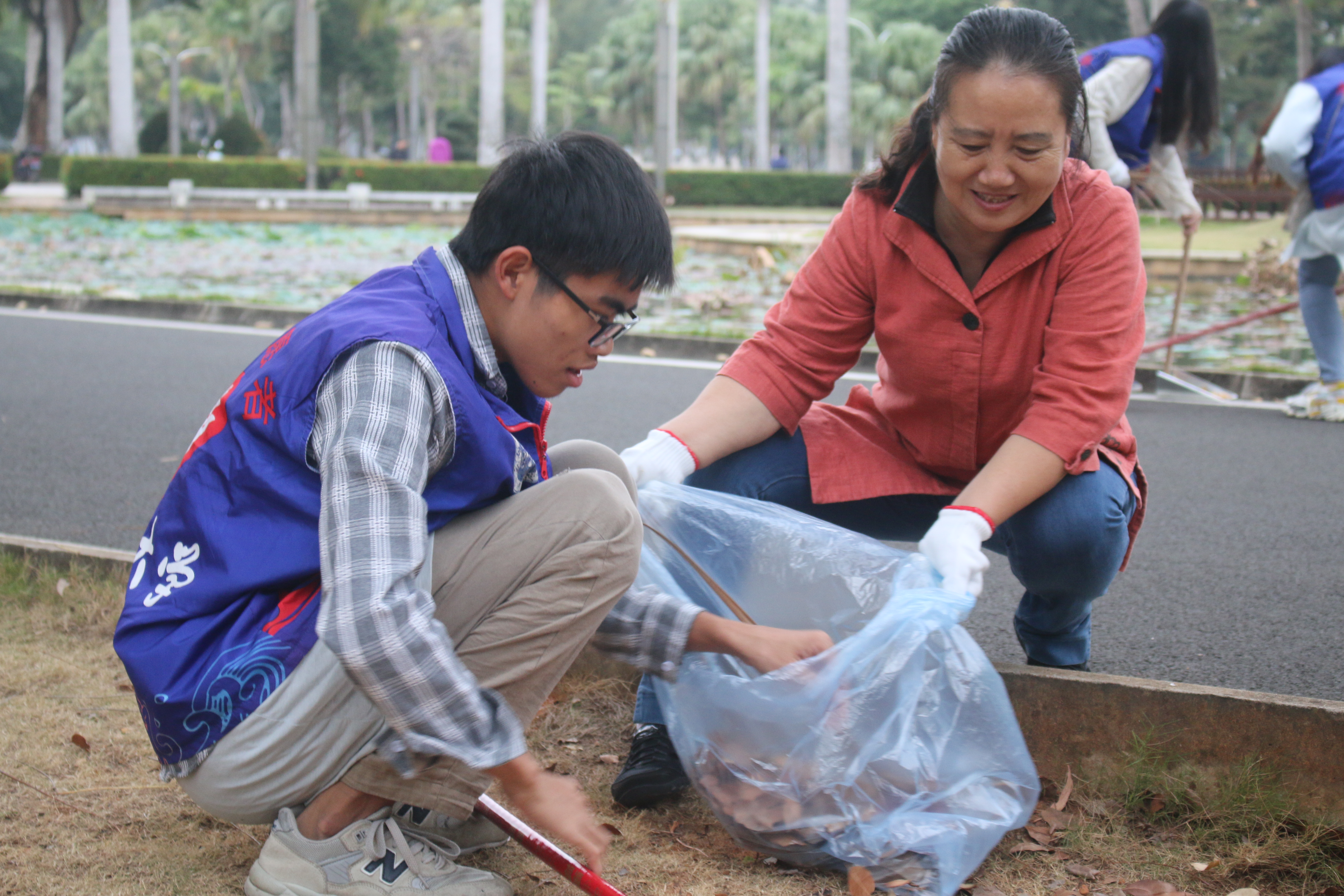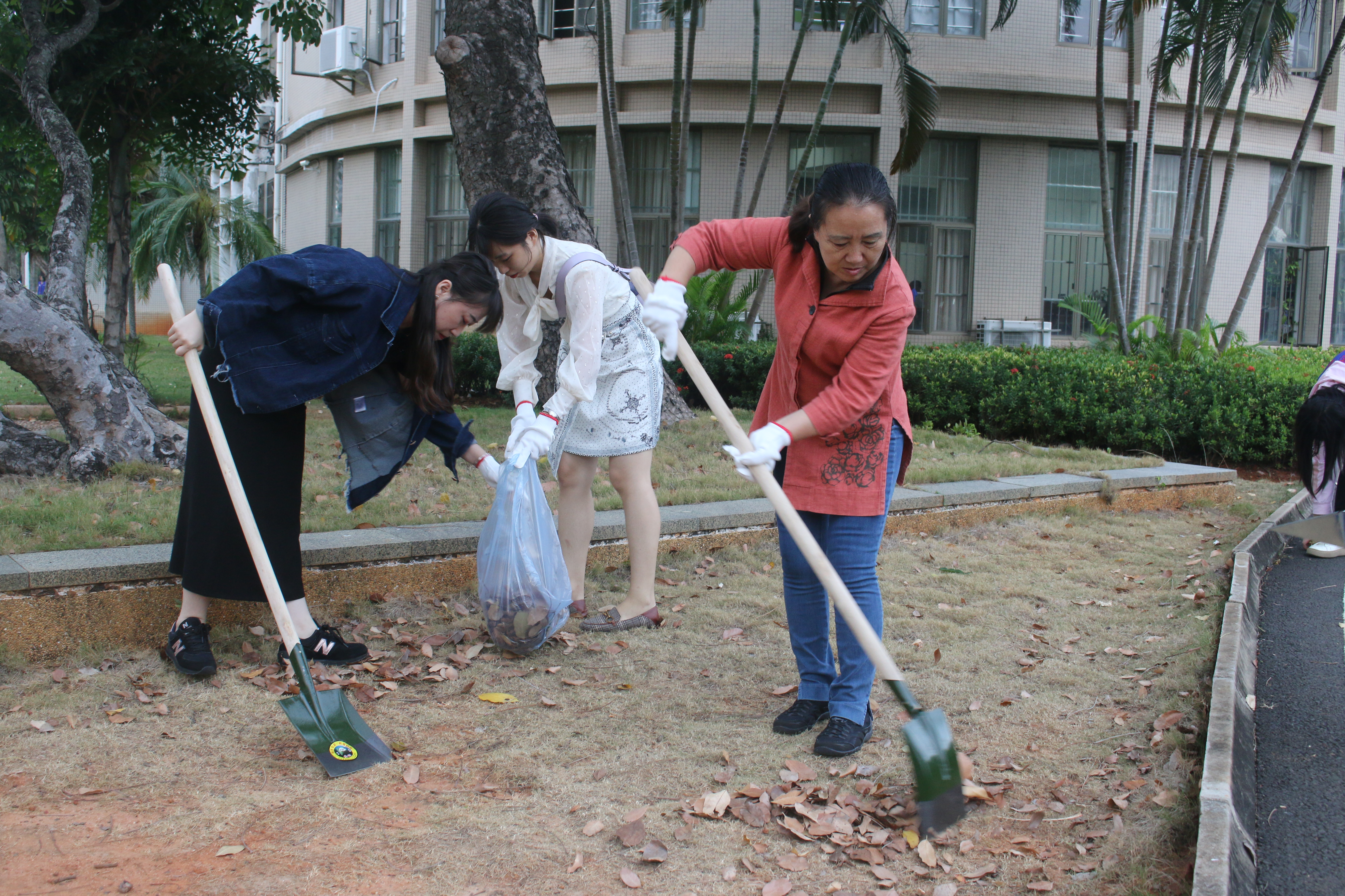 负责的清扫区域。一部分人负责清扫道路上和草丛里的垃圾与落叶,并将其堆积在一个区域,由另一部分人收装入袋。其中,老师们与志愿者们用铁铲将道路旁的杂草一点点清除,并将一些废木移动至垃圾回收点,这使得道路两旁更加整洁美观。