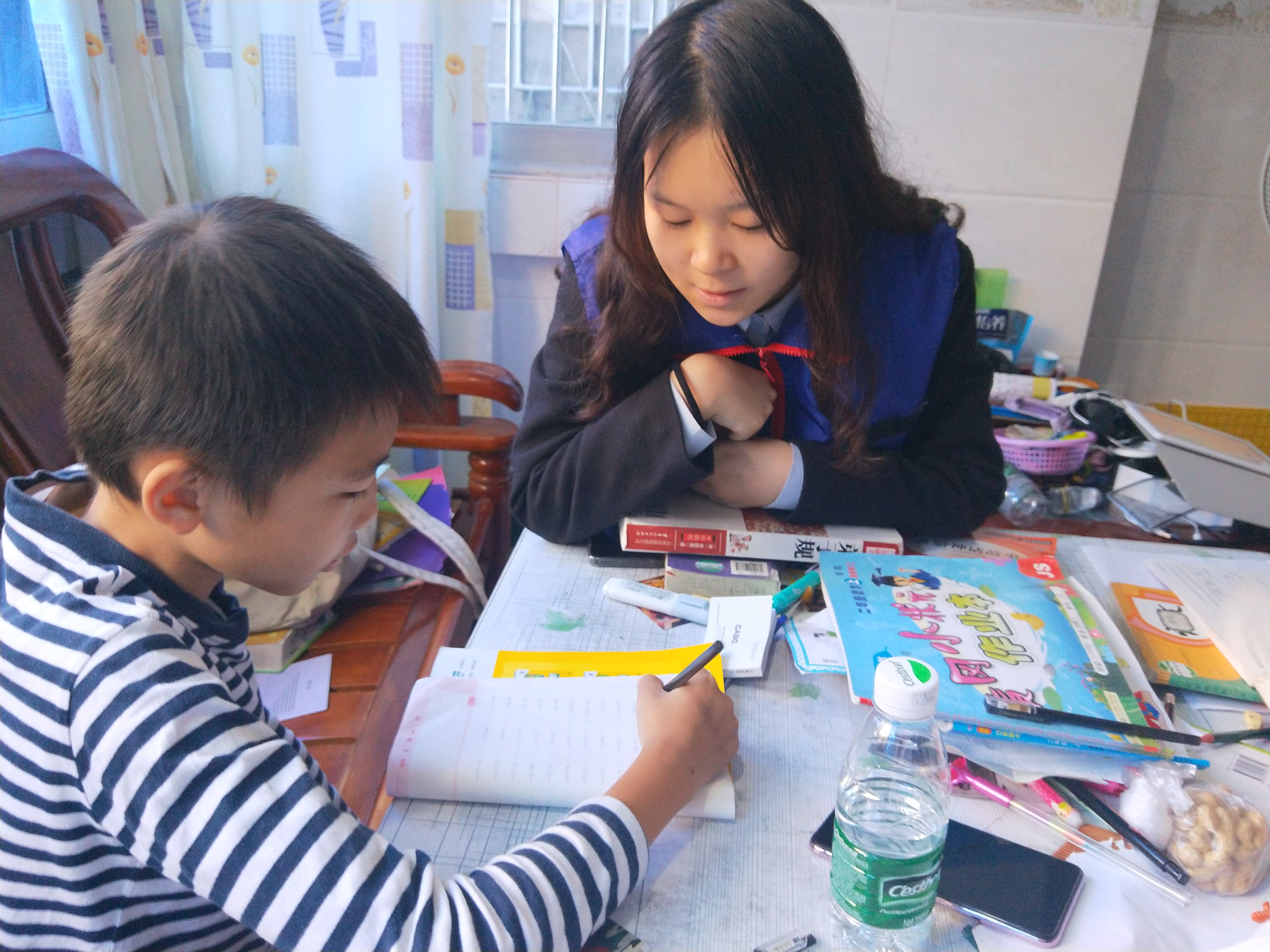 志愿者为孩子检查作业