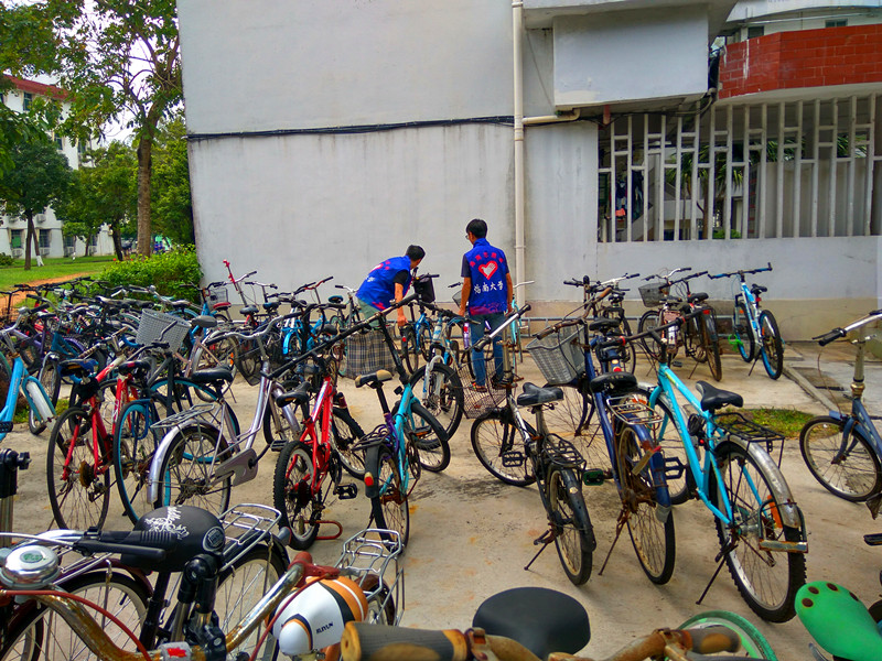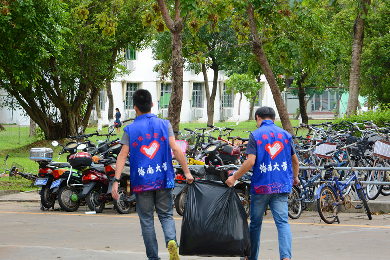 志愿者由行政楼出发至负责区域——1至5号宿舍楼。为了清理的有序进行,本次活动负责人将所有志愿者分为五个小组,分别对五个区域进行清理。受莎莉嘉台风的影响,宿舍楼前随处可见杂乱的树枝树叶、白色垃圾等,倾倒在地的自行车等交通工具也是十分之多。志愿者自觉分为两三人一组,或扶起倒地的车辆,或清扫地面垃圾,缺少清理工具的志愿者只能徒手拾捡垃圾。经过一个多小时的艰苦奋战,五栋宿舍楼下的车辆已经恢复了井然有序的状态,周边卫生也得到了显著地提高,地面的枯枝枯叶等各种垃圾均被打包统一堆放到垃圾堆放点,校园环境得到了很好的恢复与提高。