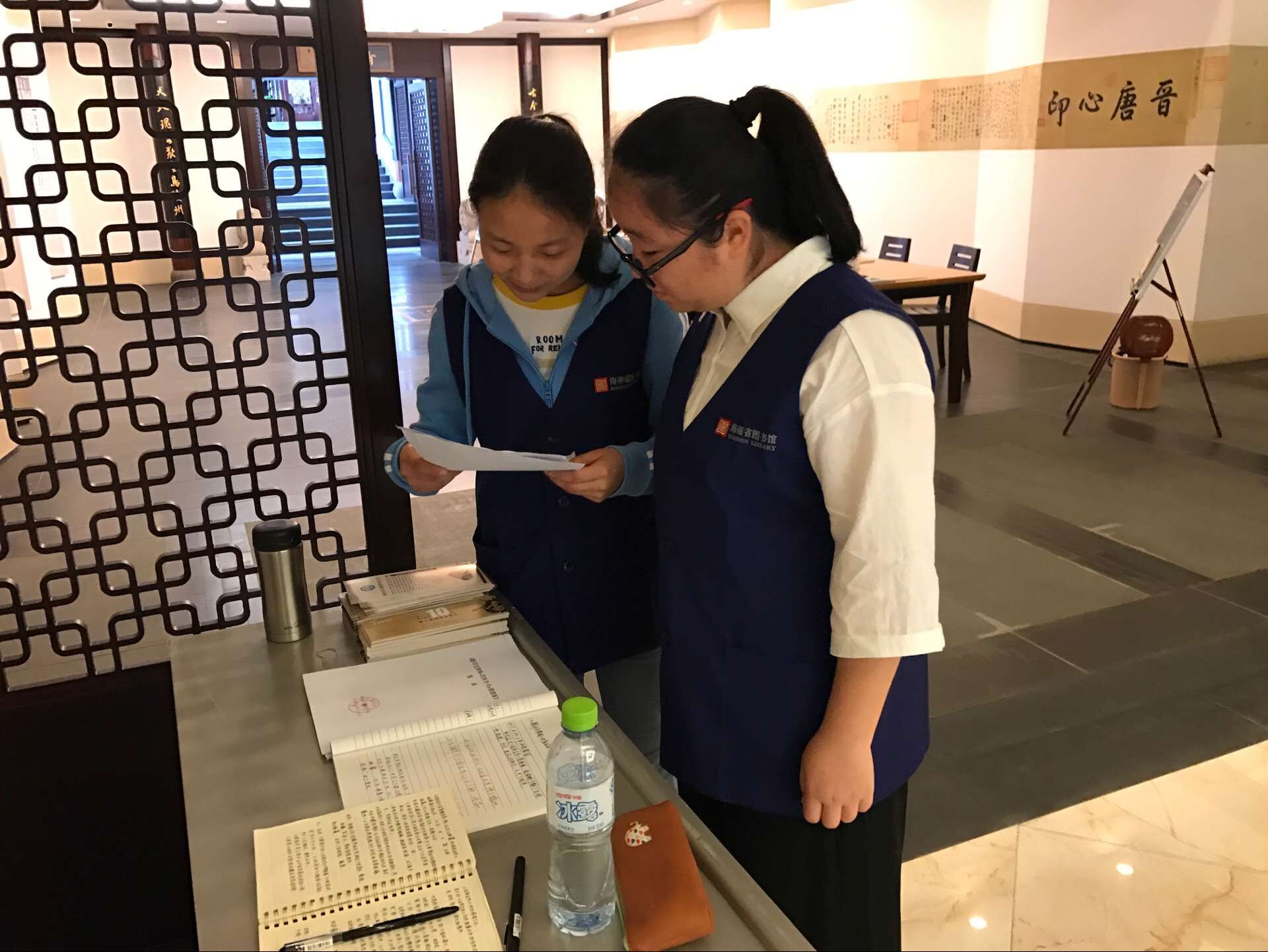 图书管理人员和志愿者整理来访人员名单