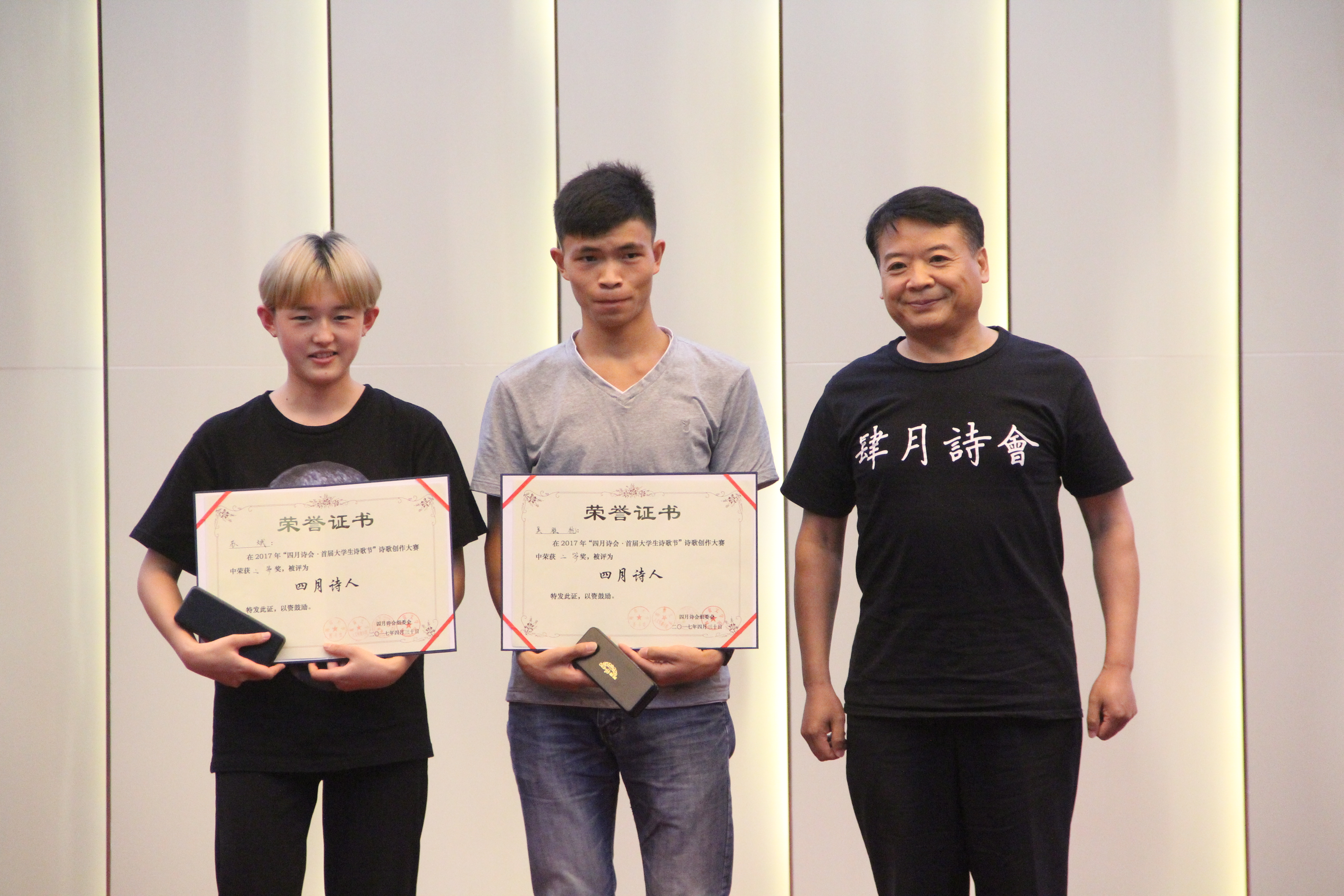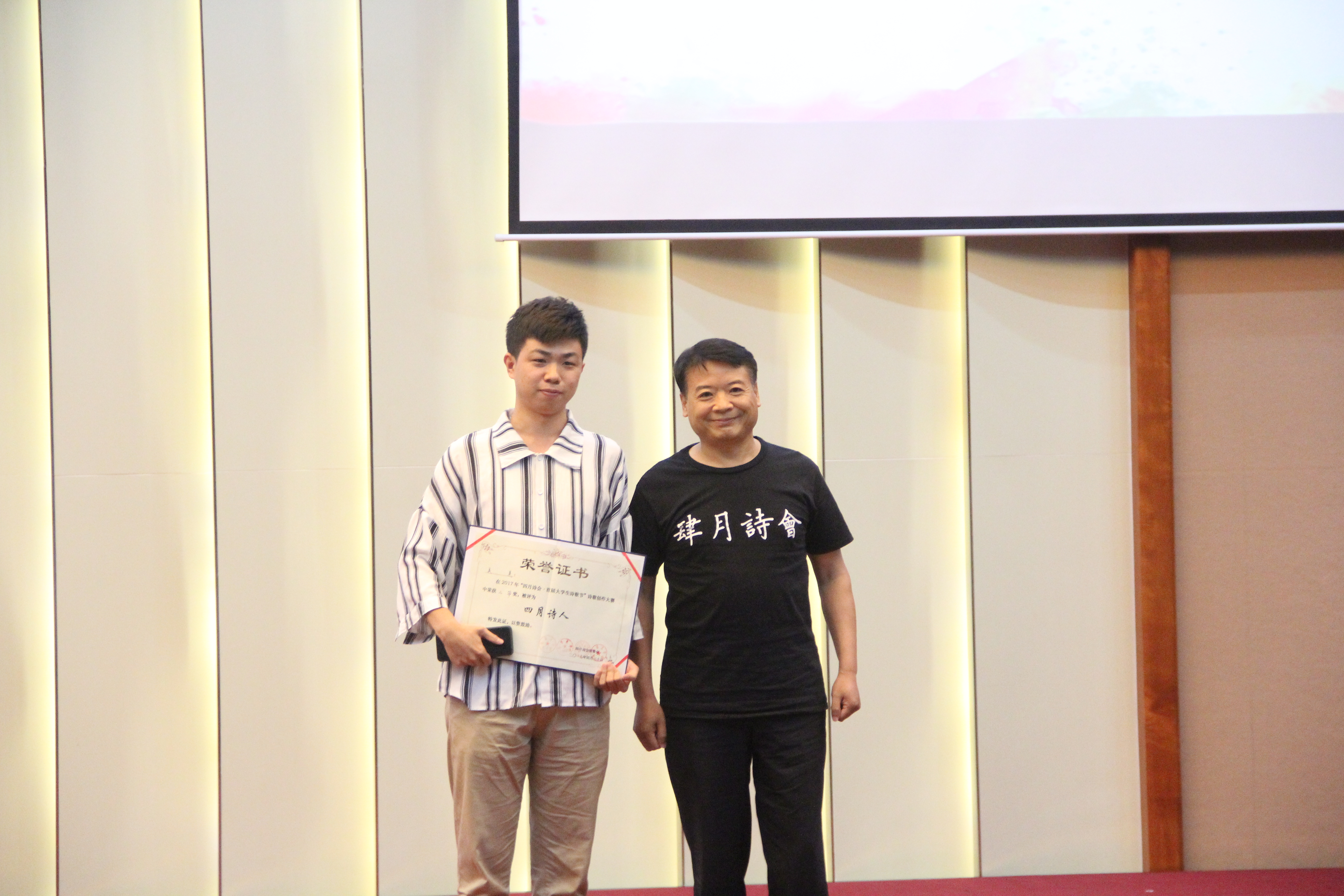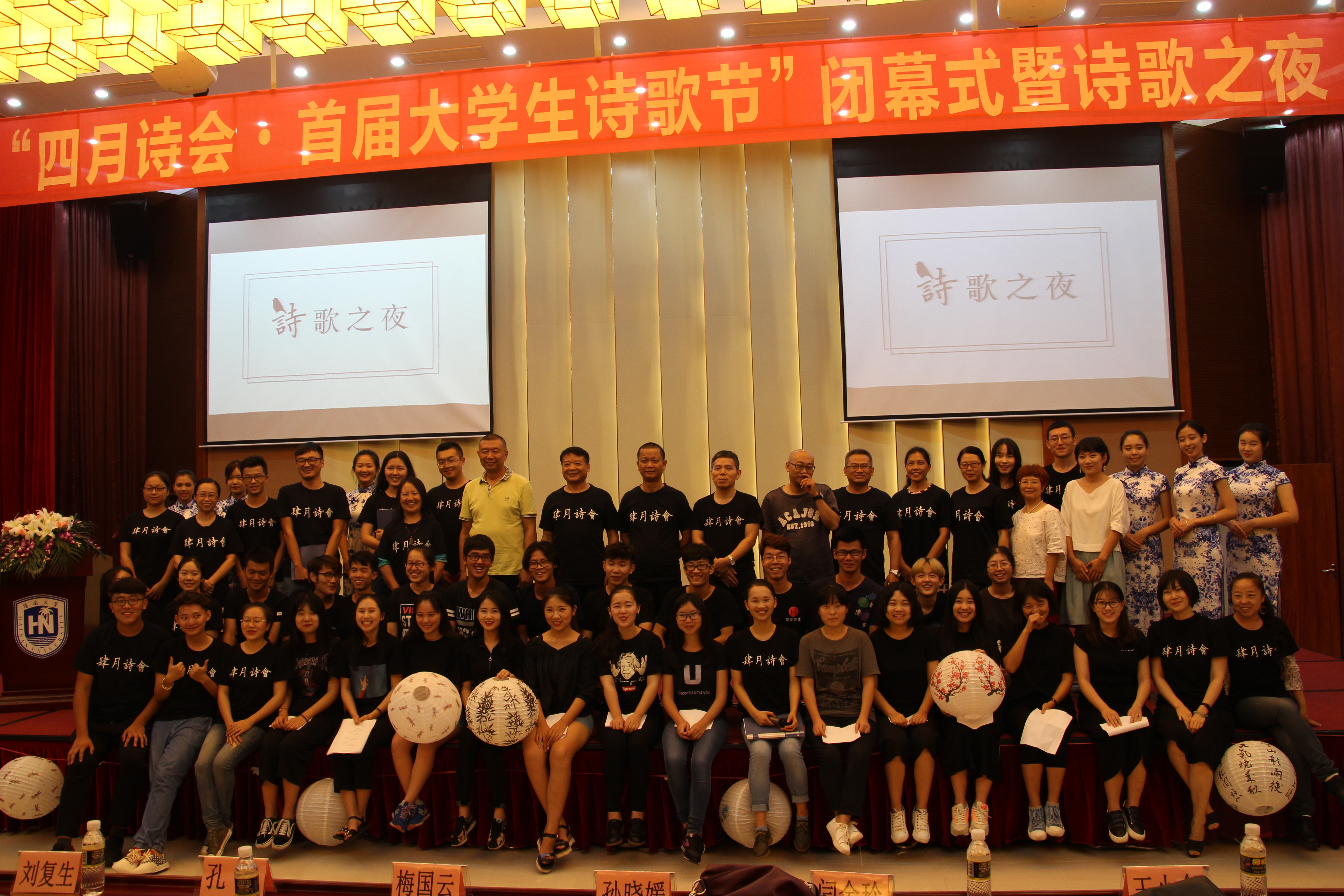 人文传播学院院长刘复生教授上台发言。刘复生教授代表四月诗会组委向莅临本场晚会的来宾以及参赛的大学生表示热烈的欢迎和衷心的感谢,此外,他也希望这一枚被点燃的诗歌的星火可以继续燃烧,不断传承。随后,十位朗读者向现场观众展示了本次大赛的十佳作品。他们走近作者,感受在这春暖花开的四月书写的诗篇,声情并茂地述说着四月诗人的心声。组委会也邀请到了海南省颂读学会秘书长巨东先生现场朗读本次大赛的优秀作品《我的父亲喜欢吃酒》,巨东先生以他饱满的情绪将全场气氛推向高潮。晚会中,李曦冉、叶何俊演绎的诗歌民谣《借我》迎来了热烈的掌声,在互动环节,主持人更是一次次调动了观众的热情。在众人的期待下,晚会揭晓了“四月诗会?首届大学生诗歌节”诗歌创作大赛的获奖情况,并在晚会现场进行了颁奖典礼。组委会共收到了来自全国各地的三千余件来稿,有二十名参赛选手从中脱颖而出,荣获“四月诗人”称号。最后,在全体工作人员朗诵的《春之舞》中,首届大学生诗歌节画上了完满的句号。