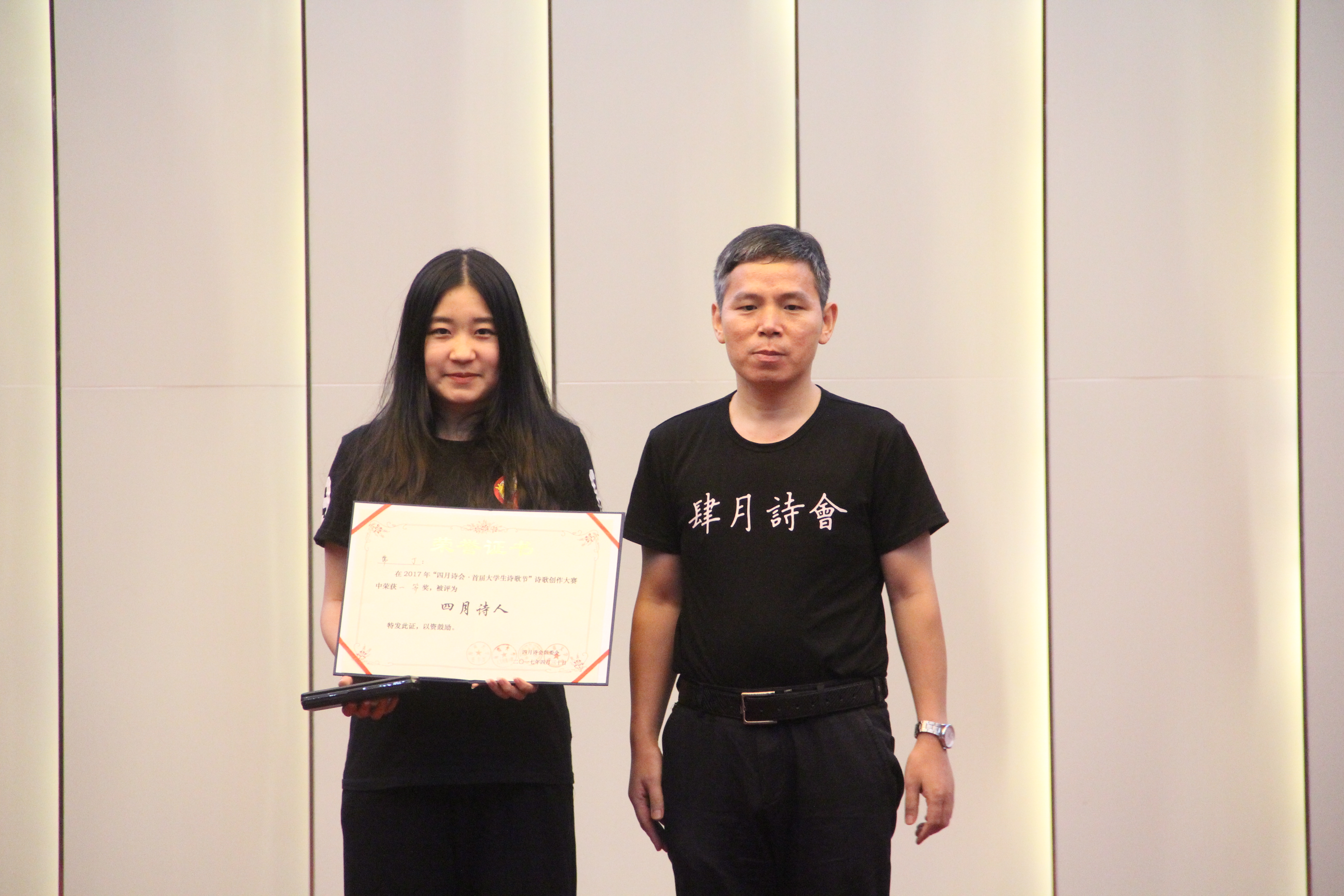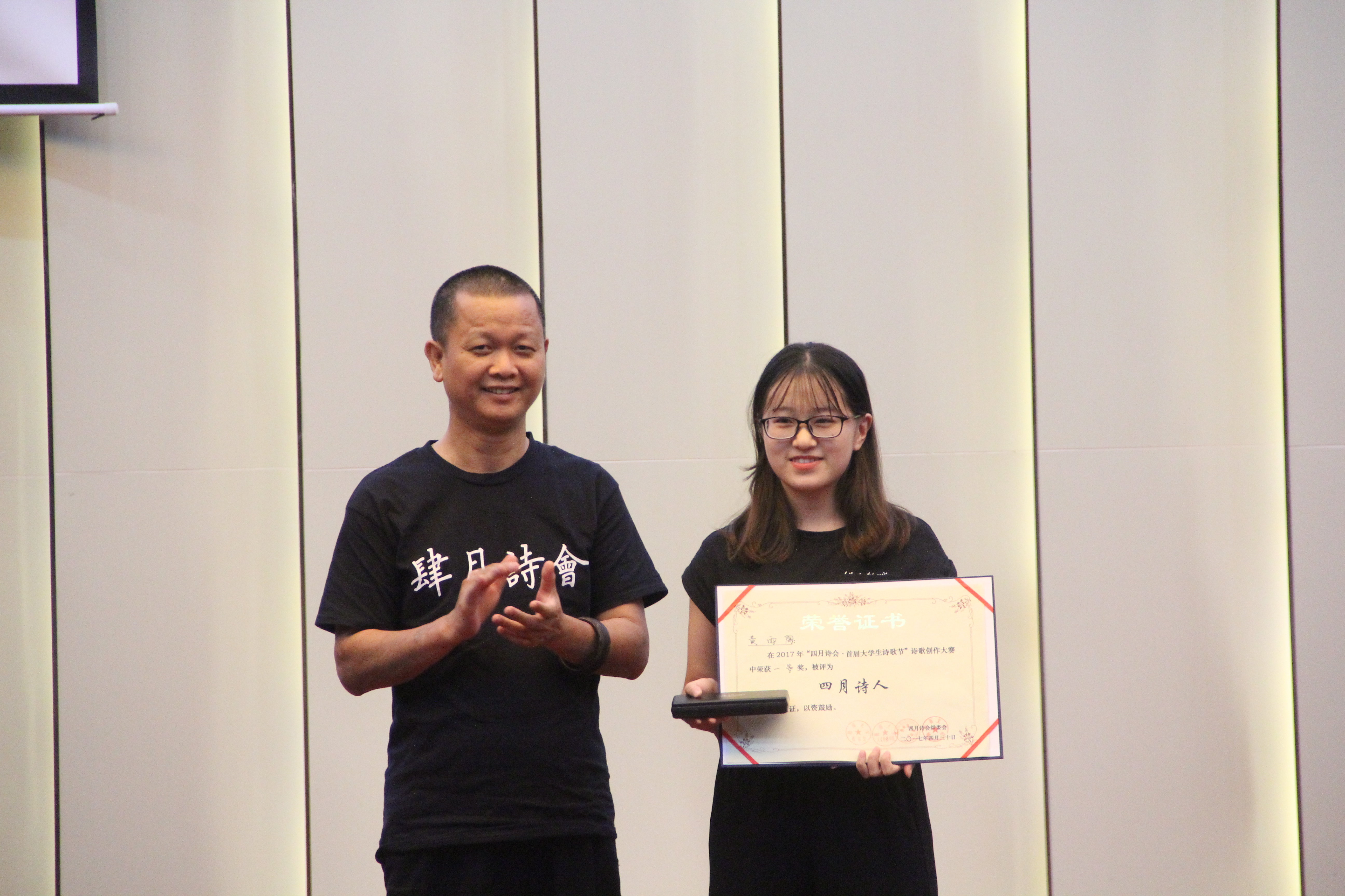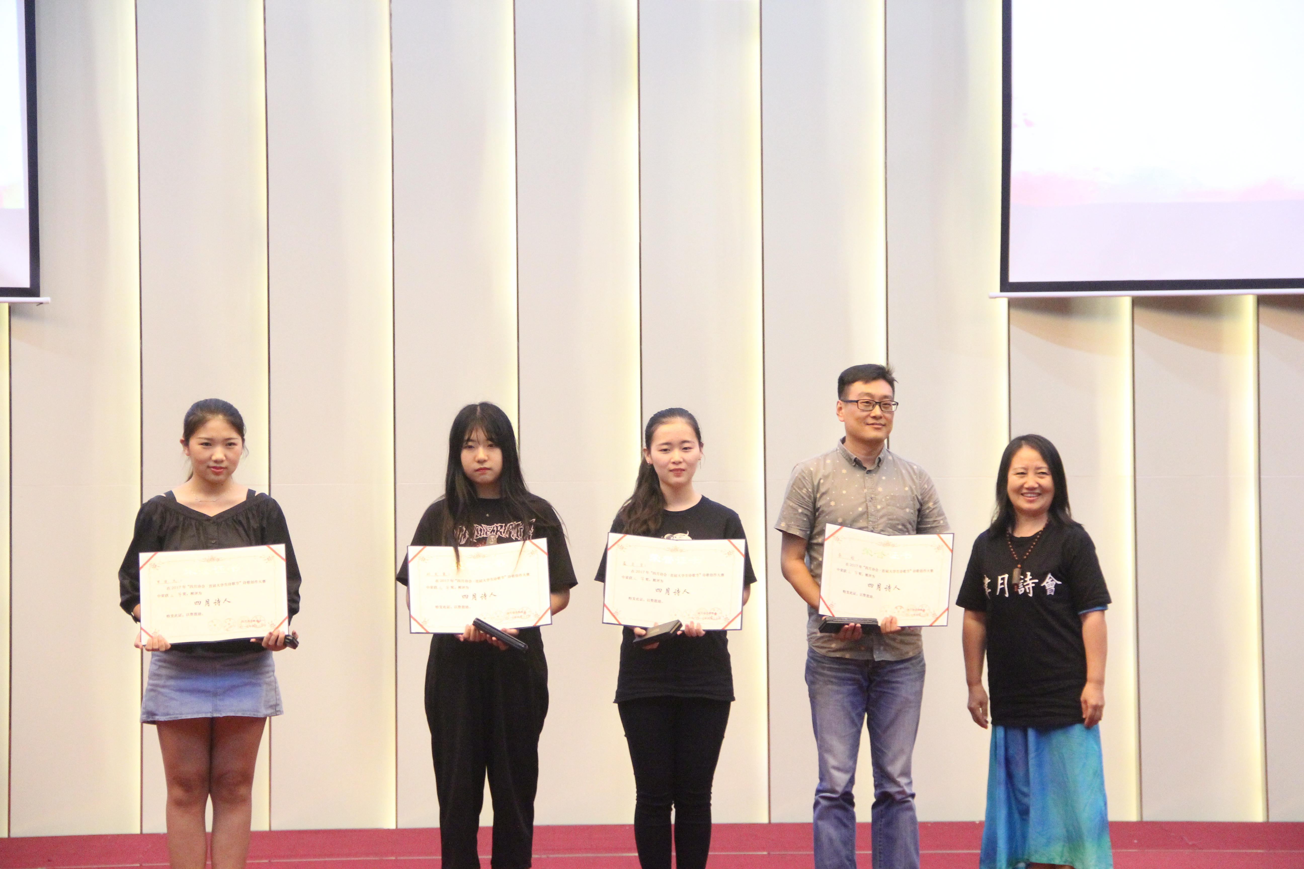人文传播学院院长刘复生教授上台发言。刘复生教授代表四月诗会组委向莅临本场晚会的来宾以及参赛的大学生表示热烈的欢迎和衷心的感谢,此外,他也希望这一枚被点燃的诗歌的星火可以继续燃烧,不断传承。随后,十位朗读者向现场观众展示了本次大赛的十佳作品。他们走近作者,感受在这春暖花开的四月书写的诗篇,声情并茂地述说着四月诗人的心声。组委会也邀请到了海南省颂读学会秘书长巨东先生现场朗读本次大赛的优秀作品《我的父亲喜欢吃酒》,巨东先生以他饱满的情绪将全场气氛推向高潮。晚会中,李曦冉、叶何俊演绎的诗歌民谣《借我》迎来了热烈的掌声,在互动环节,主持人更是一次次调动了观众的热情。在众人的期待下,晚会揭晓了“四月诗会?首届大学生诗歌节”诗歌创作大赛的获奖情况,并在晚会现场进行了颁奖典礼。组委会共收到了来自全国各地的三千余件来稿,有二十名参赛选手从中脱颖而出,荣获“四月诗人”称号。最后,在全体工作人员朗诵的《春之舞》中,首届大学生诗歌节画上了完满的句号。