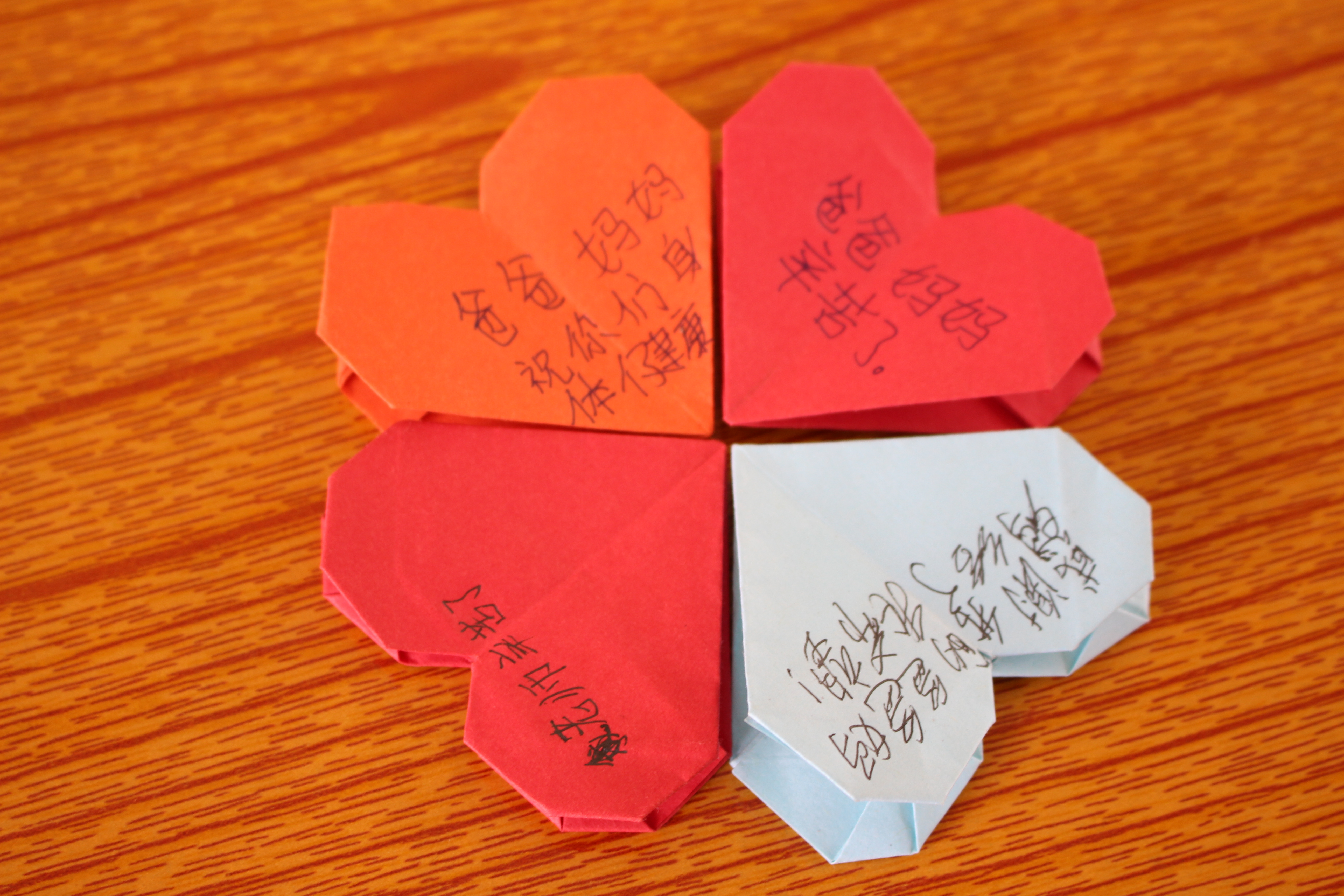 小班和中班以“感恩”为主题,采取讲故事和做游戏的方式开展。在游戏过程中,感恩的观念深入到孩子心中。大班采取多种形式,引导孩子们将理论与实践相结合,取得了良好的效果。第一环节,由国学组蔡文科对“我成长,我快乐”主题进行细致讲解,联系现实生活进行了基本的心理方面的知识科普。第二环节,由工艺组纪晓娜教授大家折爱心,然后每个学生爱心上写下对老师、父母等想说的话,由孩子们将折好的爱心贴在“七彩树”上。第三环节,组织孩子们一起打扫教室卫生,引导孩子们动手实践、爱护卫生。