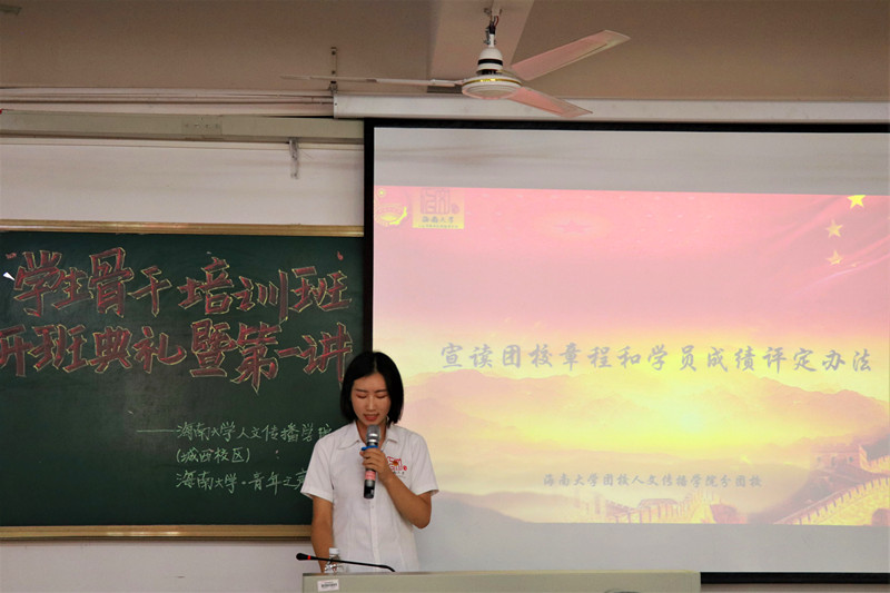 开班典礼在庄严的国歌声中拉开帷幕,熊文军老师在开班典礼上致辞, 他以本期团校培训主题——“不忘初心跟党走,青春建功新时代”——鼓励学员铭记学生干部为大家服务的初心,不断加强学习,努力成为一个更优秀的人。2017级学生高闻代表学员发言,她认为学生干部作为优秀学生代表,应严于律己以身作则,树立典范及起到带头模范作用。主持人王安祺为学员宣读团校章程和团校学员成绩评定办法。开班典礼在全体学员合唱中国共产主义青年团团歌《光荣啊,中国共青团》中圆满落幕。