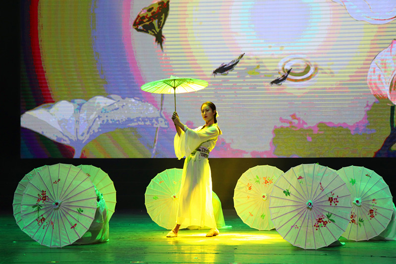 首先,由学院文工团带来的开场舞点燃了全场的气氛,跳动的音符,舞动的身姿,展现着青春的活力。一曲歌舞结束后,紧接着,晚会进入第一篇章“恋恋桃花源”。“我们奔跑着在这条路的中间,努力用汗水为梦想灌溉”,歌曲串烧《日落之歌》正是刚经历过高考的新生心路写照,让现场观众感触万千,掌声不断;同样由学院文工团带来的舞蹈《江南烟雨》让观众沉浸在南方清新婉约的静谧之中;相声《说大学》一捧一逗则在连连抖包袱中使得大家捧腹不已,一致叫好。