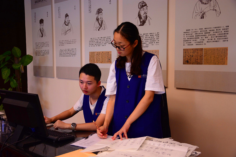 (城西校区)东门集合,准备前往省图书馆。到达省图书馆古籍部后,古籍部乔红霞主任热情地接待了团队志愿者,并就后期工作进行协商,对人员安排及具体分工进行了调整。接着,乔主任就古籍的一些专业知识给志愿者进行了讲解。随后由青协带队人员给志愿者们进行分工并开始工作。志愿者们沉浸在古籍区浓郁的文化氛围中,将 “汉字记忆”活动中,各个书法爱好者的书法作品进行编码并登记在册,最后对这些作品进行整理保存。另有一组志愿者在“汉字记忆”书写区进行相关工作,整理清洁书写区环境,对前来的书法爱好者进行引导。