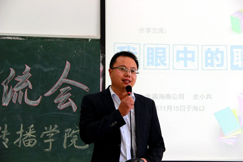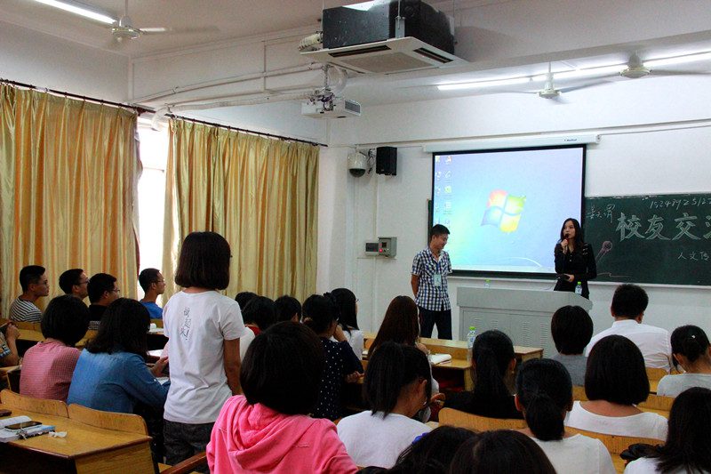 2012届广告系校友杜盼盼目前担任海南富力房地产开发有限公司策划部主任,在交流会中深情回顾了自己的大学生活。曾经担任学院团委学生副书记的她告诫2014级同学们,在大学里学好专业的同时也要积极参加团学等组织,提高自己与人沟通能力和组织协调能力。2008届中文系校友史小兵目前担任格力集团海南分公司行政部部长兼工会主席,向同学们强调了发掘自我的重要性,并向同学们推荐了心理学书籍《九形人格分析》。他稍后又为同学们分析了当前的就业形势,并提出了“职业发展有不同选择,自己要把握好选择权。” 2011届中文系校友臧会彬目前为《国际旅游岛商报》记者,2014届广告系校友姜天渭目前担任海南瑞思文化传播有限公司总经理(创业),两位校友在和同学们分享了自己的从业心路历程后,也都为同学们提出了如何规划未来职业的宝贵意见。