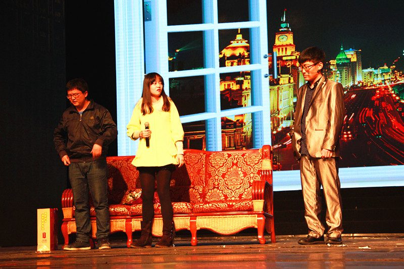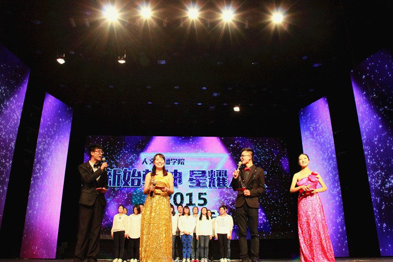 校团委黄小欧副书记,人文传播学院党委孙晓媛副书记,人文传播学院石晓岩副院长,汉语国际教育专业系主任马荣江博士,教务办陈传君老师以及学工办公衍峰老师、熊文军老师、王森森老师、王俊延老师。整场晚会节目流行与古典兼收,温情与火热并举,形式多样,精彩纷呈。 19日19:30。晚会首先播放了由人文传播学院团委学生会制作的精彩宣传视频,视频对人文传播学院的发展进行了回顾与展望,并对现场人文学子表达了浓浓的新年祝福。紧接着一段劲爆的开场热舞《Black Or White》点燃了全场的气氛,拉开了整场晚会的帷幕。晚会共分为 “似锦年华,执手青春”、“流景美韵,共舞今朝”、“馨雅花开,情绽人文”三个篇章,三个篇章内容各有特色。在“似锦年华,执手青春”中,14级广告学2班带来的振奋人心的歌曲《We Are The World》体现了海大人文学子怀揣梦想、不断奋斗的精神;笑声工作坊选送的小品《上门女婿》趣味盎然,演员夸张的动作、生动的台词让观众忍俊不禁,掀起了晚会的小高潮。在“流景美韵,共舞今朝”中,由情色小说