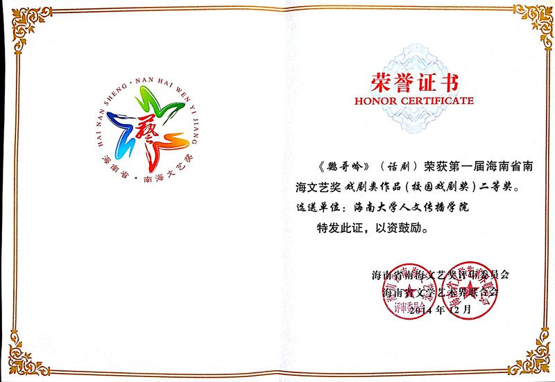 十佳学生社团“特殊贡献奖”。剧社近年来得到了学校领导的亲切关怀和大力支持,剧目《常规与例外》参加“2013年金刺猬大学生戏剧节”获最佳舞台设计奖和优秀剧目奖。本次南海文艺奖获奖剧目《鹦哥岭》曾获2014年第四届中国校园戏剧节 “最佳组织奖”、“校园之星奖”。这些荣誉的取得,与各级领导的关怀和支持是分不开的,与广大师生的共同努力是分不开的,与海棠剧社全体成员的辛苦付出是分不开的。 据了解, 海南省“南海文艺奖”是经中共海南省委、海南省人民政府批准设立的全省文学艺术界的综合性文艺最高奖。每两年评选一次。本次奖励定名为“第一届海南省南海文艺奖”,旨在奖励我省近年涌现的优秀文学艺术作品,推动我省文艺事业大发展大繁荣。