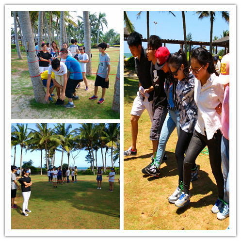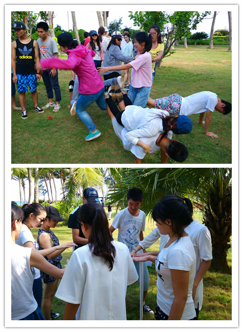 上午的素质拓展分为团队展示和“两人三足”两个部分。活动根据部门进行分组,每组人数为九人左右,每组有5分钟时间准备团队的名称、队旗、队歌、口号以及动作,在准备时间结束之后进行展示。八组团队的展示都别出心裁,像是“海盗一家”团队,他们将张雨生的《大海》进行了改编,唱出了自己的风格;“格格巫”团队唱着“坐上火车去文昌”做出与之相配的动作来模仿着火车开动;“two兔队”准备了可爱的动作和口号,还有小兔子的队旗。团队展示之后便是考验团队协作能力的“两人三足”。在经过组员之间的磨合和练习之后,各组的配合不断完善,团队意识也得到了增强。最终,上午的素质拓展第八组“八一team”获得了第一名。