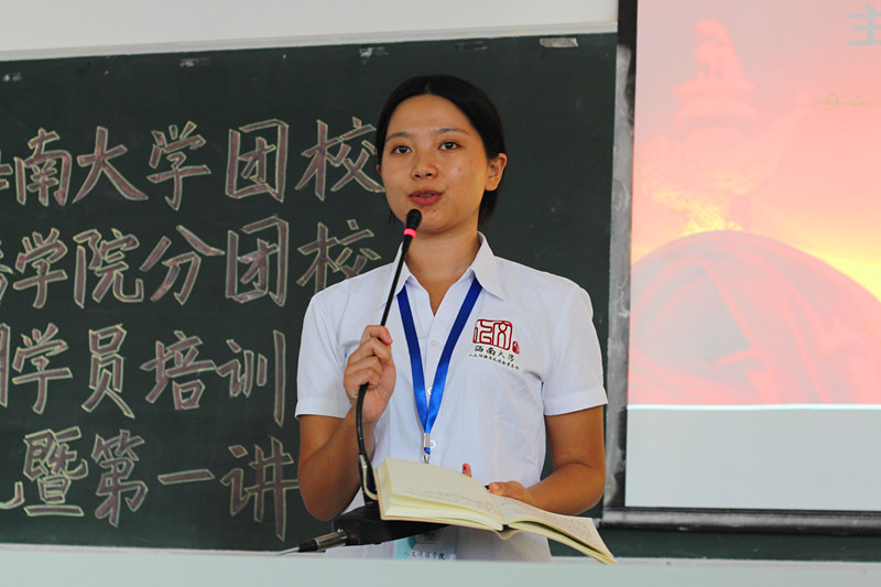 接下来,担任团课第一讲主讲嘉宾的熊文军老师开始了本期骨干培训的第一讲。熊文军老师以“走近中国共青团”为题围绕共青团的创立过程、共青团的光辉历史、共青团的性质和基本职能、高校共青团工作模块及新时期共青团的重心工作等方面进行了讲解。在对新时期共青团重心工作的讲解中,熊老师着重从社会主义核心价值观主题教育、创新创业——“挑战杯”全国大学生课外学术竞赛、进军网络新媒体、志愿服务开展四个方面进行深度剖析,让同学们对新时期共青团的重心工作有了系统的认识和理解。课堂上,同学们用心倾听、认真记录,老师与同学们多次进行互动,学习氛围严肃庄重而不失积极活泼。