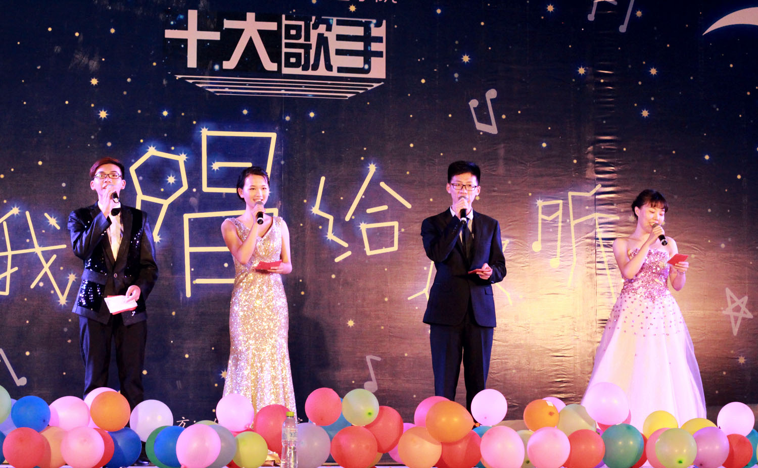 19:00,十大歌手决赛正式拉开帷幕。全场比赛共分为“把我唱给你听”、复活赛、“给我一首歌的时间”三轮比拼。首先是由X-CREW艺术团带来的街舞表演,瞬间点燃了全场的热情。紧接着就是本场比赛第一轮的实力比拼,本轮比赛的13位选手抽签分为六组,每组两人进行对唱,另一位抽到幸运签的选手和一位场外搭档进行帮帮唱,前六名直接进入第三轮。在第一轮中,每一位选手都拿出自己的实力争取晋级资格。四号冯学玲带来的英文歌曲《THE SHOW》以清新而又不失动感的节奏引爆全场,5号陈诗洁和9号吴旗带来的《如果没有你》用细腻的嗓音和感情表达了“如果没有你,多出来的爱我会留给自己”的主题。2号王雅伦和6号吴浩楠带来的《莫斯科郊外的晚上》以含蓄而优美的旋律让在场的每位观众和嘉宾都回味无穷。在六组选手演唱结束后,D-TAC艺术团带来的动感热舞再一次将全场节奏推向高潮。在紧张的统计评分后,吴浩楠、王雅伦、陈灿、赵思婷、陈佳丽、李曦冉成功晋级到第三环节。在接下来的“复活赛”中,第一轮淘汰的7位选手按编号由大到小演唱两分钟左右的歌曲,票数最多者进入第二轮,在这一环节中1号李天琪以一首温情的歌曲《亲爱的小孩》顺利进入第三环节。在最后一轮“给我一首歌的时间”中,11号选手陈灿以一首《悟空》揭示了叛逆、多变、乐观、坚持的“悟空精神”,引起全场掌声不断。经过激烈的角逐,最终陈灿、李曦冉分别获得第一名、第二名,李天琪、陈佳丽以45.7分的成绩并列第三名,陈诗洁、李鑫、吴旗荣获最具潜力奖。此外,各环节间的微信抽奖活动,更是一次次将全场气氛推向高潮。最后,本次十大歌手的决赛在观众意犹未尽的掌声中缓缓落下帷幕。