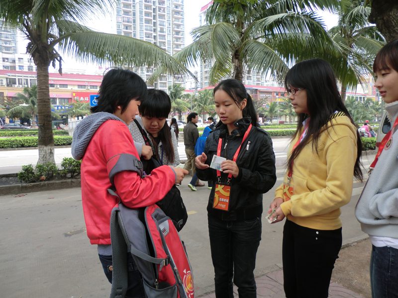 北门、南门、东门外的公交车站开展“零钱兑换,便民出行”的志愿活动,意在减少以往乘客乘车缺少零钱的困境以及所导致的乘客擅自收费的不文明现象,净化海南省乘车环境。