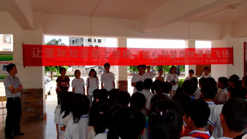 校团委《关于开展2013年大学生志愿者暑期“三下乡”社会实践活动的通知》要求,围绕“践行见远、宝岛筑梦”的活动主题,人文传播学院组建了“梦想课堂·微影寻梦”院级重点实践团队赴海口市苍西小学开展暑期社会实践活动。2013年7月19日下午,在学院辅导员熊文军老师的带领下,团队的十四名学生志愿者抵达入住苍西小学开始为期一周的暑期社会实践活动。 实践团队又分两个分别由9人组成的“梦想课堂”实践小分队和由5人组成的“微影寻梦”实践小分队。 “梦想课堂”主要通过团体辅导、多媒体教学和户外素质拓展等方式为农村小学生开拓视野、增长见识,塑造梦想。“微影寻梦”实践小分队除给学生授课外,通过对“梦想课堂“的记录以及对小学生、志愿者、学校工作人员、村民等人物的镜头采访,捕捉触动人心的瞬间,发掘平凡人的朴素梦想,以后期制作微电影的方式记录海大学子的迅寻梦之路。 苍西小学位于海口市苍西村,是一所拥有众多外来务工人员子弟的农村小学。活动共有三年级一班、五年级一班和五年级二班共三个班近百名小学生参加。 “梦想课堂”欢乐多 “让爱和知识插上翅膀,让心和梦想随课堂飞扬”是“梦想课堂”的口号,也是贯穿于每个任教志愿者心目中的一个理念。在志愿者们前期精心的准备下,安全教育、文明礼仪、心理健康、海南文化、祖国山川、世界奇观、名人故事、饮食文化、艺术欣赏、传统节日、电影赏析、科普知识等十余种多媒体课件展示,向苍西小学的孩子们展现了丰富多彩的世界,增强了他们对未来的憧憬和对梦想的渴求。拔河比赛、足球、篮球、跳绳、呼啦圈等户外活动课增强了孩子们的体魄,手工课、智力游戏课、作文演讲辅导课等特色课程的设置使小学生们的课堂更加丰富多彩。 “梦想课堂”采取户外素质拓展与室内多媒体教学及特色课程相结合的方式,不拘泥于传统的授课方式,以大学生的视角带给孩子们更开阔,更灵活,更新颖的思维和知识,受到了小学生的热烈欢迎! 7月24日,实践活动第五天,“梦想课堂”的志愿者们指导组织了一场“我的梦想”主题演讲比赛。小学生们的演讲各有特色,十分精彩。发明家、科学家、音乐家、画家、医生、老师、宇航员……每个孩子都有着不同的梦想。活动旨在以演讲赛的形式引导鼓励孩子们勇敢登台大声说出自己的梦想,奋力逐梦;锻炼他们的语言表达能力和自信心。比赛期间,穿插方言念古诗等小游戏和志愿者献唱等小节目,使现场气氛异常活跃,小学生们和志愿者们都表现出蓬勃向上的精神风貌。 爱,让梦想延续 对于已经结下深厚情谊的志愿者们和小学生们来说,时间总是过得匆促。7月26日是“梦想课堂”的最后一天课程,下午3点,在志愿者们的策划下,举办了一个简单的结课仪式。小学生代表、志愿者老师代表、团队指导熊文军老师、苍西小学沈长春校长分别发言。小学生代表分享了几天来的学习体会,表达了对大姐姐大哥哥们的真诚谢意,志愿者教师们则把深深的嘱托和祝福留给这些小小的梦想家们。熊文军老师表达了对苍西小学和沈长春校长为人文传播学院志愿者们搭建社会实践平台的真诚谢意,勉励志愿者教师们认真总结实践过程中的收获和不足,为本年度的暑期社会实践画上圆满的句号。苍西小学沈长春校长在最后的发言中表达了对志愿者团队的诚挚谢意,赞赏了志愿者们的奉献精神和带来的精彩课堂活动,同时对志愿者们致以美好的祝愿。 结课仪式上30名在此次活动中表现突出的小学生授予“优秀学员”称号。七天的时间,志愿者们已经与孩子们结下了深厚的情谊,离别之际,孩子们和志愿者们都热泪盈眶,孩子们送给志愿者们小礼物,给志愿者们写信,这些满满的都是爱。 七天的支教活动至此圆满结束,但是追梦之旅仍将继续,志愿者们在七天里付出了艰辛,更收获了快乐和成长。相信孩子们的梦想和志愿者们的梦想都会开出花儿来。爱,让梦想延续。