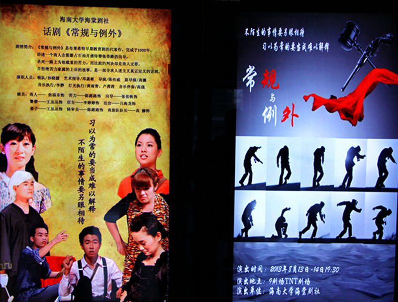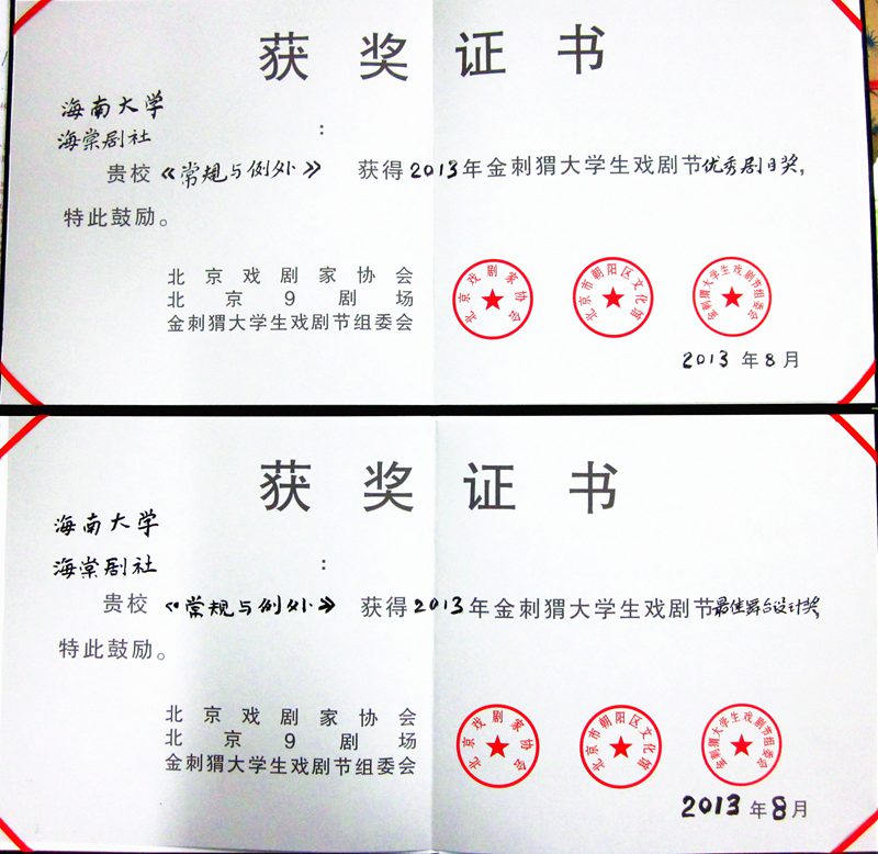 海棠剧社参演剧目《常规与例外》喜获本届金刺猬大学生戏剧节“最佳舞台设计奖”和“优秀剧目奖”,再次为我校争得殊荣。这些成绩的取得与学校党委陈封椿副书记、教务处、学生处以及学院领导的关怀、支持和帮助是分不开的。 海棠剧社《常规与例外》剧组于2013年8月10日在人文传播学院党委孙晓媛副书记和剧组指导教师邓菡彬老师的带领下应邀赴京参赛,冲击本届金刺猬大学生戏剧节奖项。《常规与例外》改编自德国戏剧大师布莱希特的经典作品,讲述一个商人企图霸占石油并虐待替他带路的向导,杀死一路上为他载重并好心给他水喝的苦力。苦力的妻子和商人对簿法庭,而法庭的判决却是商人无罪,并冠冕堂皇的拒绝苦力家属的上诉的故事。在人文传播学院邓菡彬老师指导下,该剧由2011戏剧影视文学专业学生陈传威执导,参赛演员及幕后均是2012级戏剧影视文学大一学生。 在比赛演出后的演后谈环节,大赛组委会评审专家充分肯定了我校大学生对经典戏剧勇于挑战的精神,对剧组解读布莱希特大师的方式也表示认同并提出成熟宝贵的意见 。演出的成功赢得了观众与评委的一致好评,最终摘得本届大戏节“最佳舞台设计奖”和“优秀剧目奖”。在京期间,中央人民广播电台和教育部主管、大学生体育协会主办的《阳光体育—新跃》杂志还对剧组师生进行了专访。 金刺猬大学生戏剧节创办12年来,以“热情、鲜明、纯粹”的形象,吸引着来自全国各地大学生戏剧爱好者,影响力辐射全国400余所高校。本届比赛共有包括中国传媒大学、中国戏曲学院、中国农业大学、中南大学、四川大学等20个省市的65所高校报名参加,我校海棠剧社《常规与例外》等12部戏剧作品作为优胜剧目入围终审。 海棠剧社是情色小说
