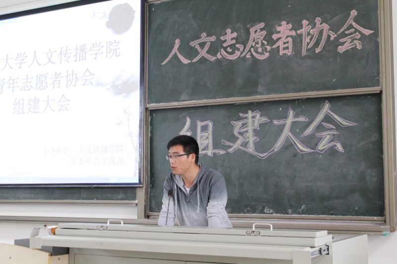 青年志愿者团队的工作亮点。大会最后,由院团委社会实践部、志愿者协会负责人和12届优秀服务志愿者分别介绍了志愿者活动的具体内容以及活动对志愿者的基本素质要求。 志愿者协会是一个友爱的群体,志愿者活动更是一个个充满奉献和爱心的活动。随着志愿者协会组建大会的圆满完成,人文传播学院志愿者队伍又注入了一股新活力。希望今后志愿者们能在各个活动中积极参与、奉献爱心,也祝愿人文传播学院志愿者协会取得更大更优的成绩。