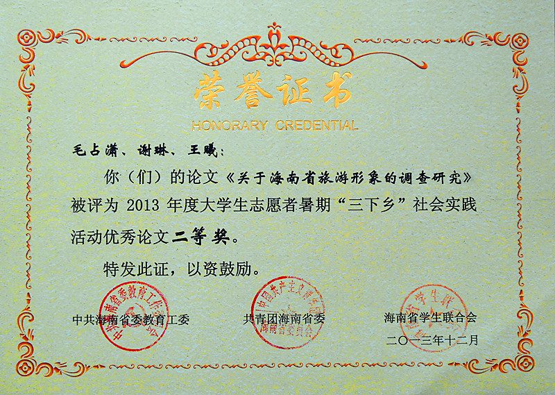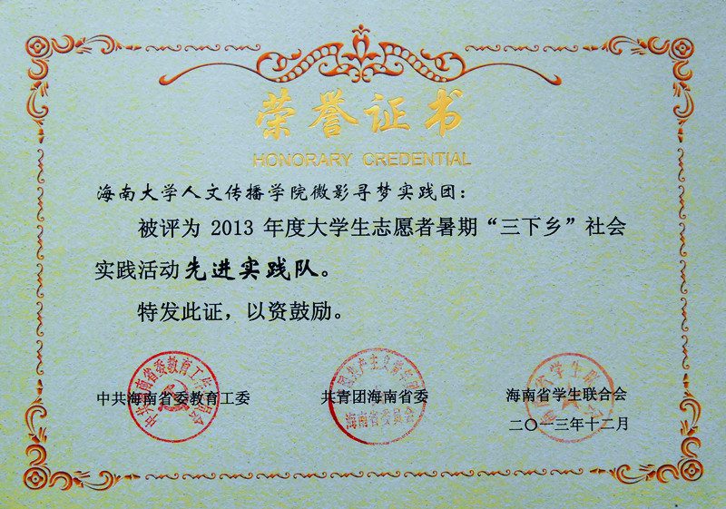 以2012级广告学专业陈伟兴同学为队长的“微影寻梦”实践团队荣获海南省2013年度大学生志愿者暑期“三下乡”社会实践活动先进队荣誉称号,2011级广告学专业毛占潇、谢琳、王曦三位同学撰写的暑期社会实践论文《关于海南省旅游形象的调查研究》获得了海南省 2013 年度大学生志愿者暑期“三下乡”社会实践活动优秀调查报告(论文)二等奖,2010级戏影专业宋子琛同学被评为海南省 2013 年度大学生志愿者暑期“三下乡”社会实践学生积极分子。 “微影寻梦”实践队于7月2日—8月24日间赴琼中摄制微电影,以期揭示“琼中女足”的精神风貌。实践队员全部为情色小说