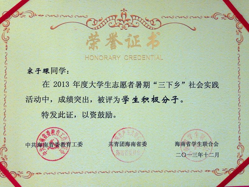 宋子琛同学获社会实践活动积极分子荣誉称号