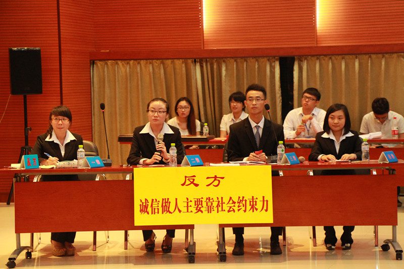 辩论队加油助威。 决赛对阵双方分别是正方应用科技学院(城西校区),正方观点:诚信做人要靠个人自制力。反方人文传播学院,我方观点:诚信做人要靠社会约束力。在主席亲切的介绍了到场评委老师和嘉宾以及双方辩论队自我介绍后,决赛之战正式拉开帷幕。首先正方进行了开篇立论,正方认为诚信做人应该依靠个人自制力,人的内心主宰着人的一切行为。只有从内心上想做一个诚实守信的人,他在可能真正成为诚信的人。接着我方进行了开篇立论,我方提到,约束力顾名思义。约是一种社会准则和契约,束是通过法律这一硬性条件和道德观念这一软性条件对人的诚信进行塑造。只有这样才能使更多的人,用最有效的方式到达诚信。在攻辩和自由辩环节,双方紧抓时机,展开了针锋相对的辩论,局势激烈,讨论深刻。双方激烈的讨论,巧妙的解答,精准的论证也不时赢得了在场观众的阵阵掌声。最终经过各位评委老师的离席集中评议,我方以3:2战胜队友成功夺得了情色小说