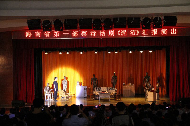 人文传播学院党委孙晓媛副书记,海棠剧社专业指导老师、人文传播学院戏剧影视文学专业邓菡彬副教授也一并出席观看了演出。 《泥沼》作为海南省第一部原创禁毒话剧,受到海南省禁毒办、团海南省委、海南省高校禁毒联盟的高度重视。该剧是根据真实人物事迹改编,主要讲述主人公马力在爱情、工作双失利的情况下受到朋友的引诱而走上吸毒的不归路,最终导致断送青春、前程乃至家破人亡的惨剧。剧目将话剧艺术与禁毒宣传教育成功结合在一起,精心设计的舞美,丰富的情景音乐,演员忘情投入的演出,演出现场气氛热烈,使观众深刻认识到毒品的危害,撼人心灵。 演出结束后,由海南省禁毒办向演员代表颁奖,并合影留念。本次演出活动由海南省禁毒办、团省委、省高校禁毒联盟主办。 《泥沼》由邓菡彬老师指导,11级戏剧影视文学专业陈传威、王彬两名同学担任导演,演员为海棠剧社成员。在经过长达11个月精心排练后,最终取得圆满成功。该剧是海棠剧社的一次社会公益性演出,同时也是海棠剧社走出大学校园,积极承担社会责任所迈出的新的一步。海棠剧社现已成为我校的一校园文化精品工程,在获得校内外各类荣誉表彰面前,海棠剧社将一如既往,创作更多更优的作品,通过话剧艺术形式,传递社会正能量,勇于担当,回馈奉献社会。据了解,《泥沼》不久也即将在情色小说